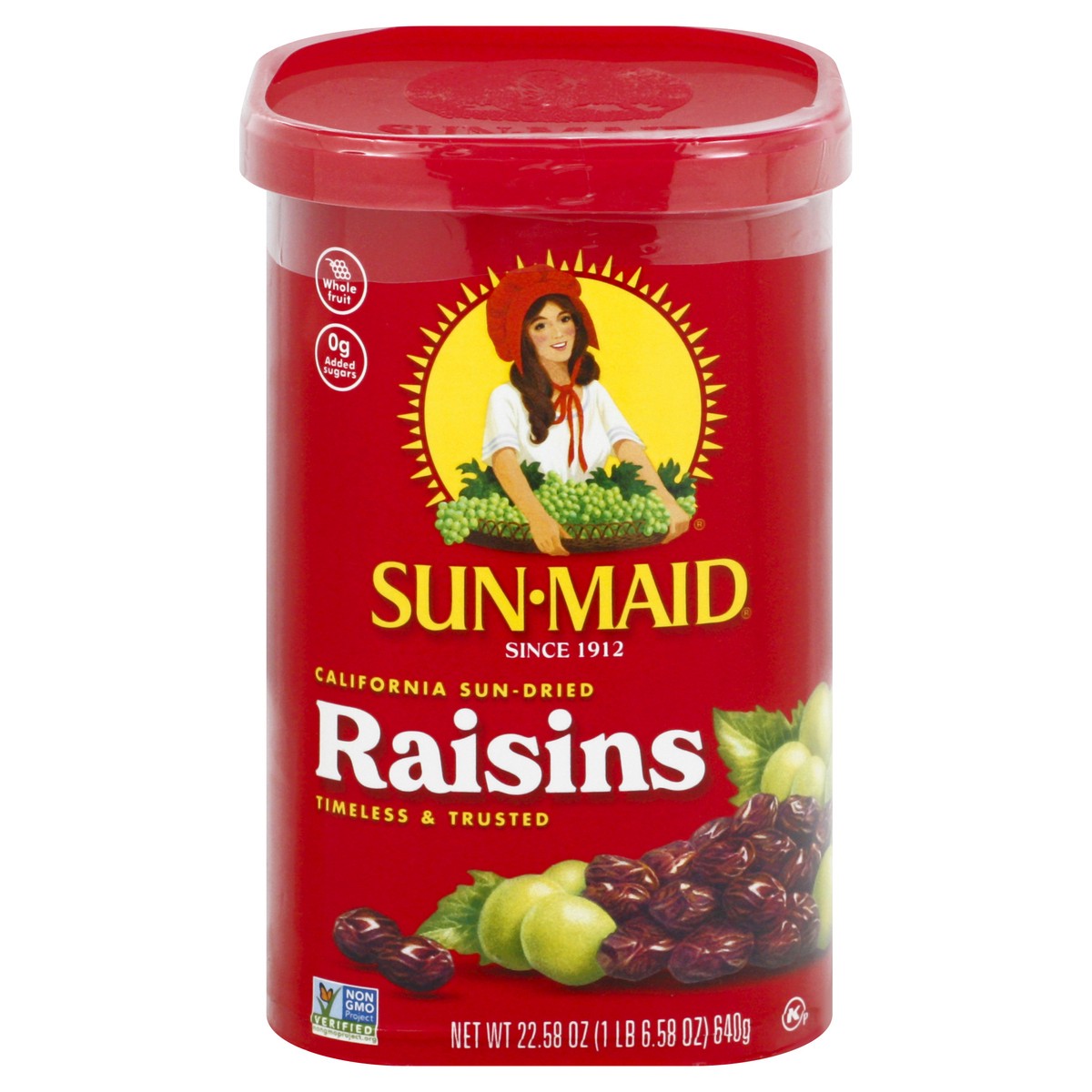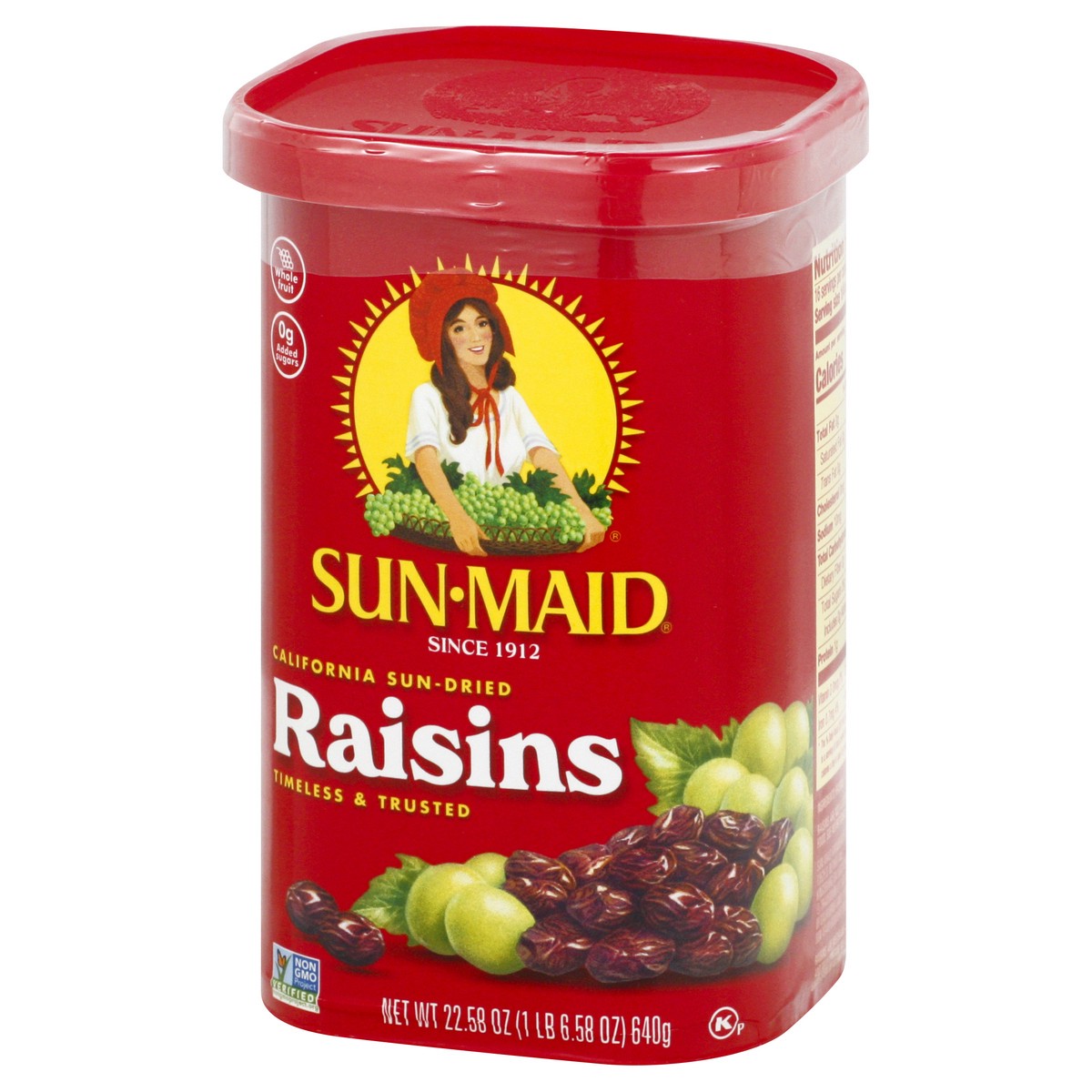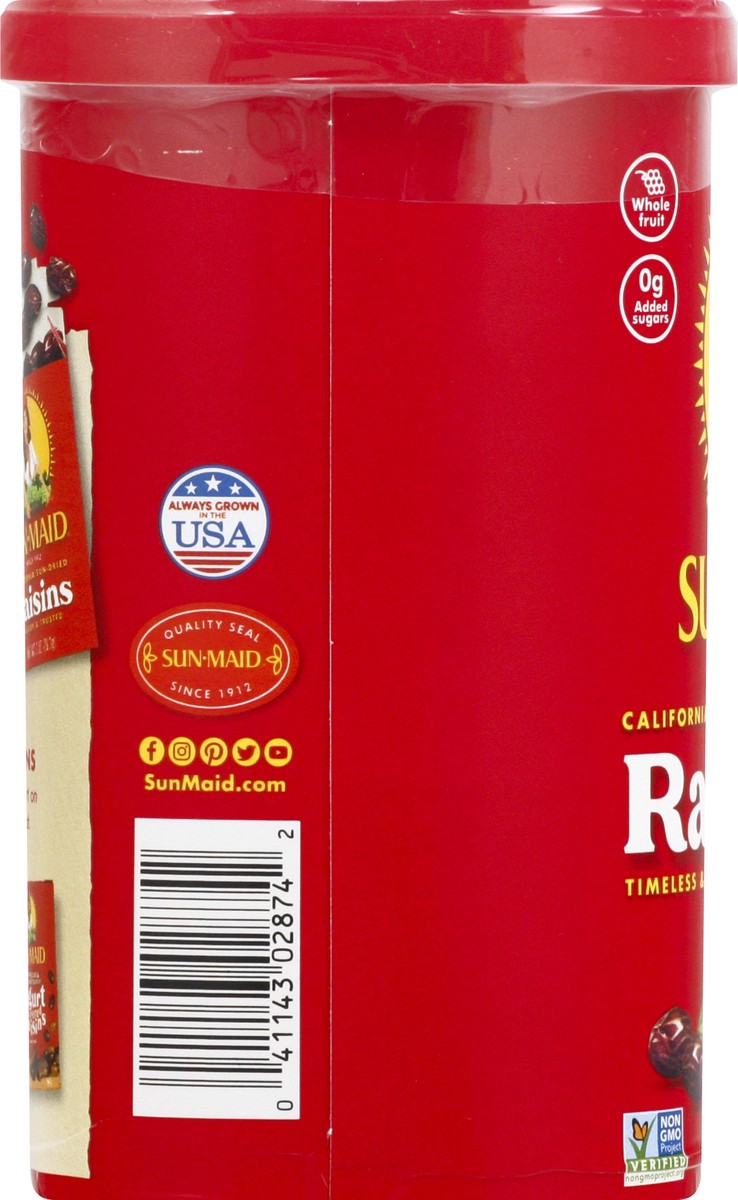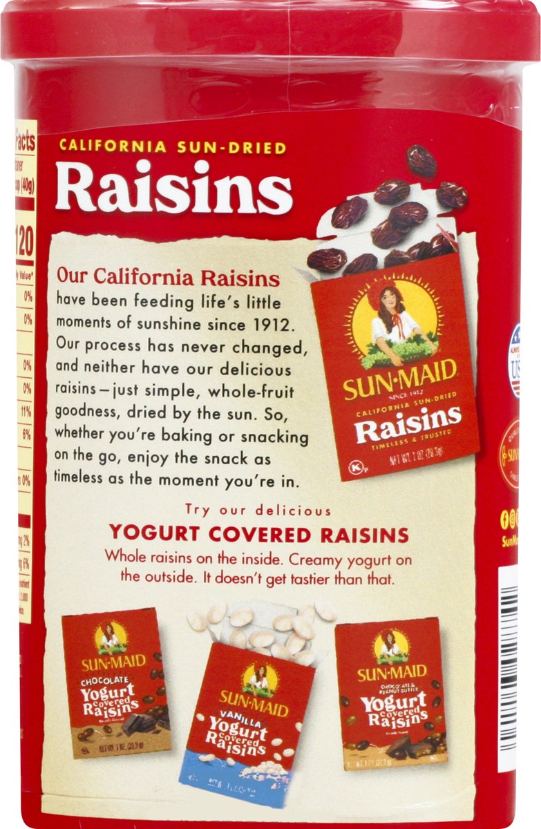 California sun-dried raisins. Timeless & trusted. 0 g added sugars. Raisins are not a calorie reduced food. See nutrition facts panel. Non GMO Project verified. nongmoproject.org. Whole fruit. Since 1…