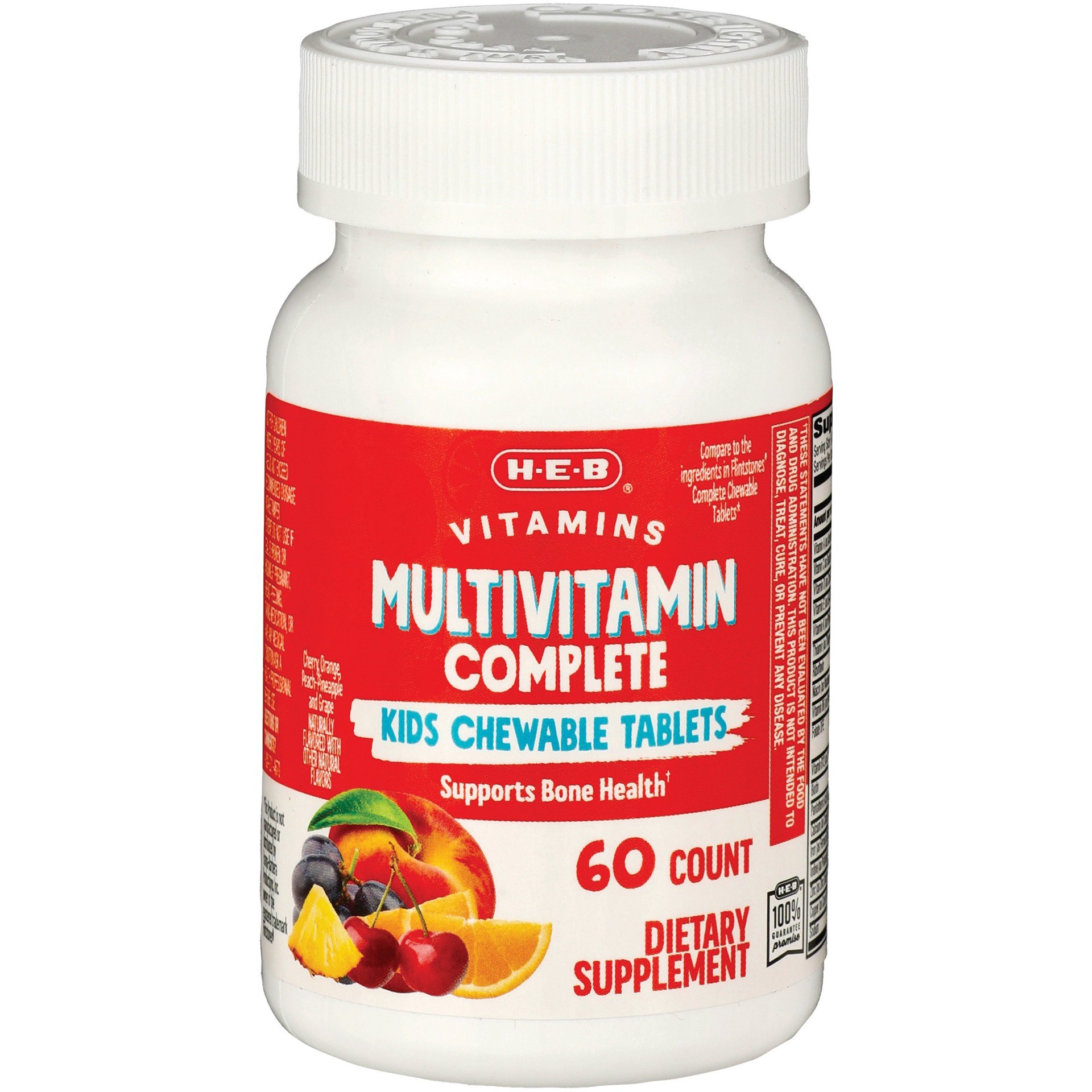 Give your children these H-E-B kids multivitamin chewable tablets and support their bone health. With no certified synthetic colors added, add them to your children's diet.• 60-count bottle of kids ch…