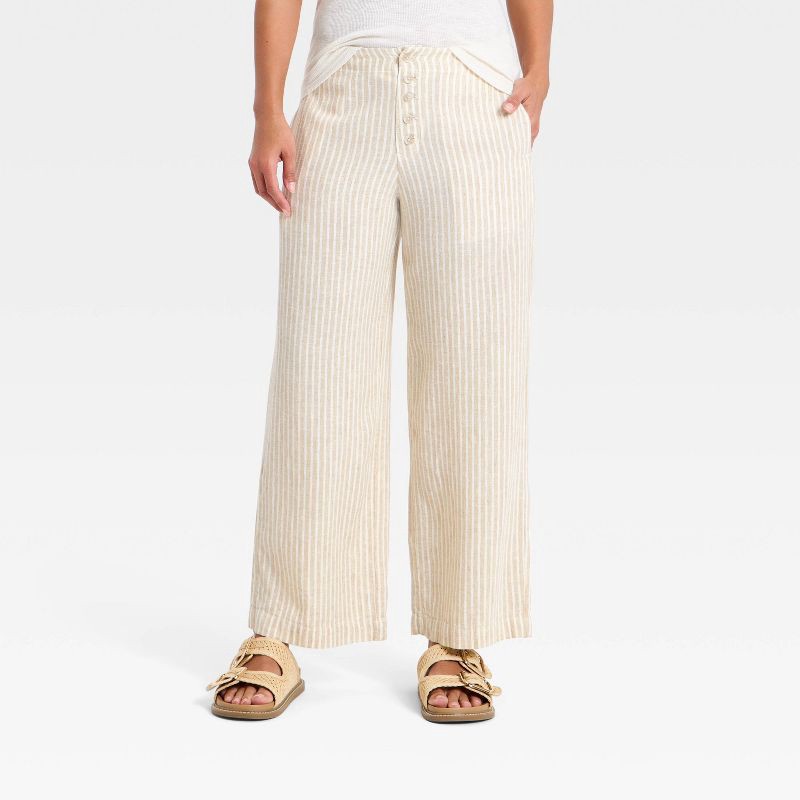 Women's Mid-Rise Linen Straight Leg Pull-On Pants - Universal Thread™ Tan Striped M