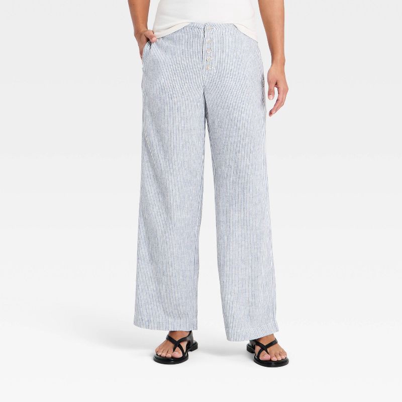 Women's Mid-Rise Linen Straight Leg Pull-On Pants - Universal Thread™ Blue Striped L