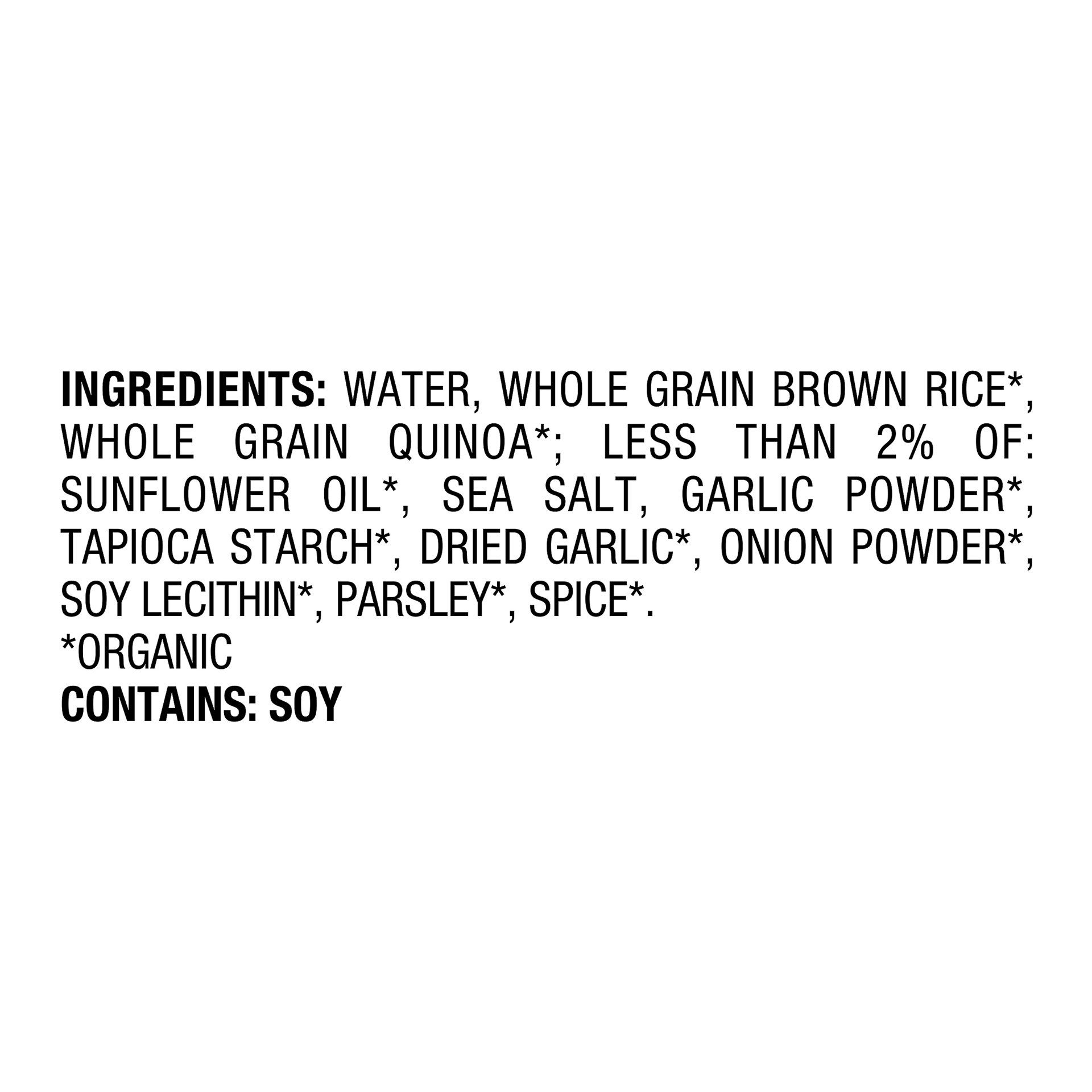 Water; Whole Grain Brown Rice (Organic, Whole Grain Quinoa (Organic, Sunflower Oil (Organic), Sea Salt, Garlic Powder (Organic), Tapioca Starch (Organic), Dried Garlic (Organic), Onion Powder (Organic…