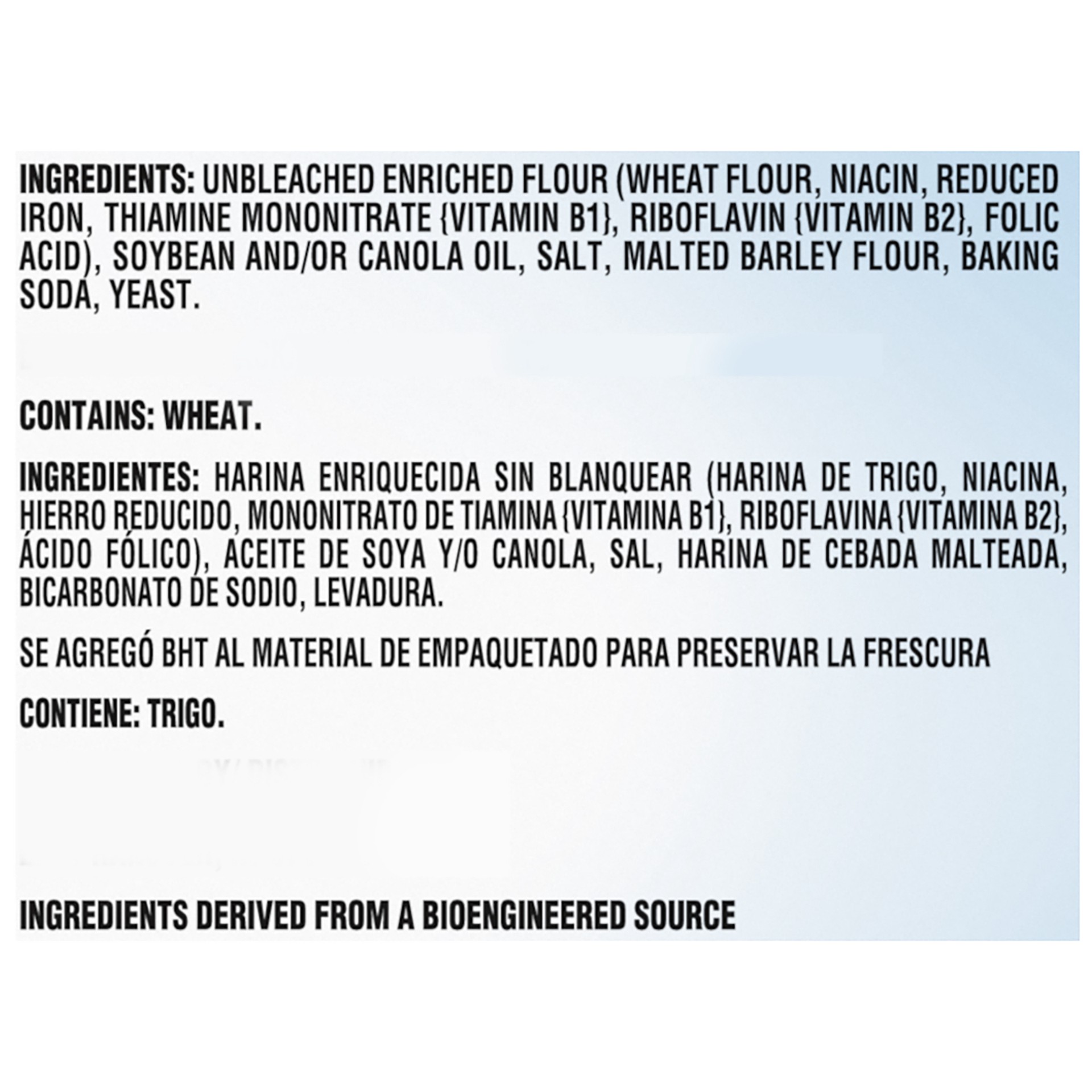 INGREDIENTS: UNBLEACHED ENRICHED FLOUR (WHEAT FLOUR, NIACIN, REDUCED IRON, THIAMINE MONONITRATE {VITAMIN B1}, RIBOFLAVIN {VITAMIN B2}, FOLIC ACID), SOYBEAN AND/OR CANOLA OIL, SALT, MALTED BARLEY FLOUR…