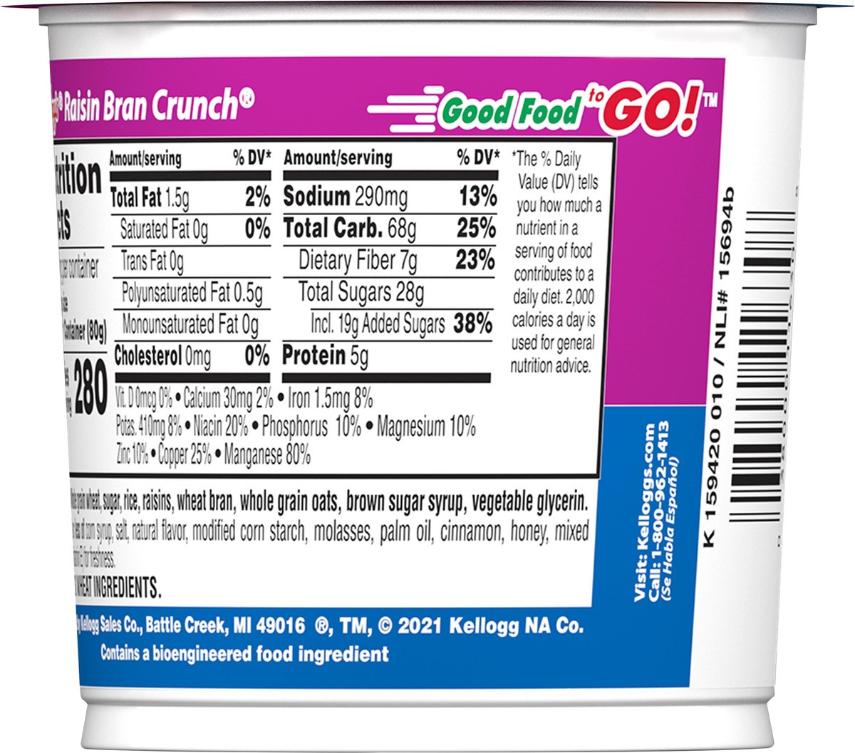 Raisin Bran Crunch Breakfast Cereal Cup Fiber Cereal Original - 2.8 Oz