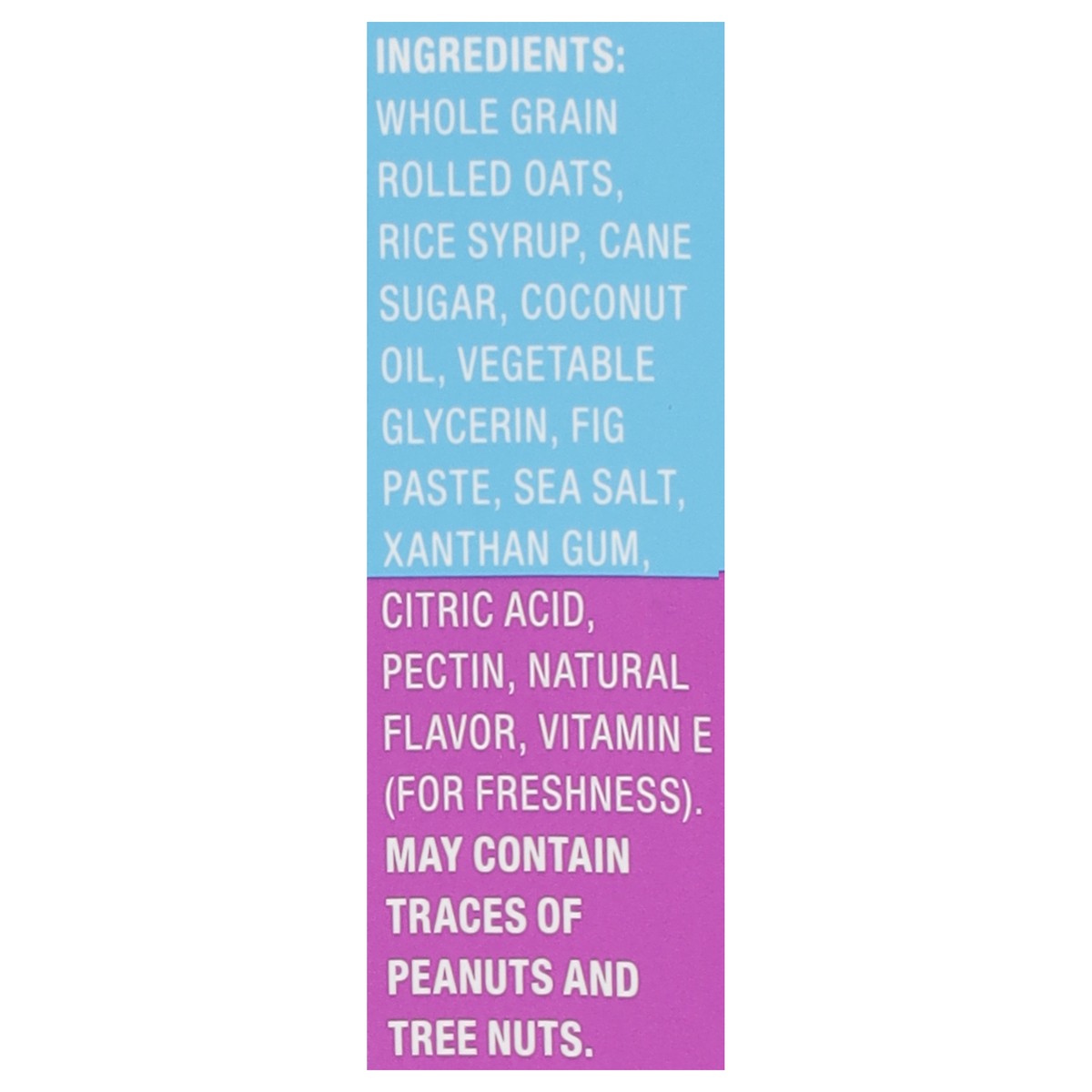 Whole Grain Rolled Oats, Rice Syrup, Cane Sugar, Coconut Oil, Vegetable Glycerin, Fig Paste, Sea Salt, Xanthan Gum, Citric Acid, Pectin, Natural Flavor, Vitamin E (for Freshness).