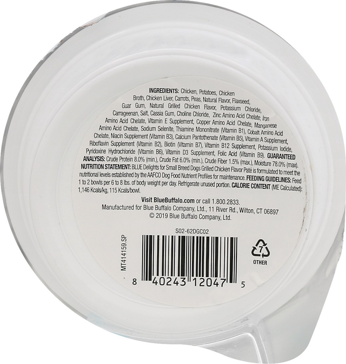 Calorie Content (ME Calculated): 1,146 Kcals/kg, 115 Kcals/bowl. Nutrition Statement: Blue Delights for small breed dogs grilled chicken flavor pate is formulated to meet the nutritional levels establ…