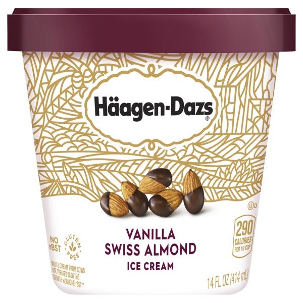 Vanilla Ice Cream: Cream, Skim Milk, Sugar, Lactose Reduced Skim Milk, Corn Syrup, Egg Yolks, Salt, Vanilla Extract. Chocolate Coated Almonds: Almonds, Sugar, Chocolate, Cocoa Butter.