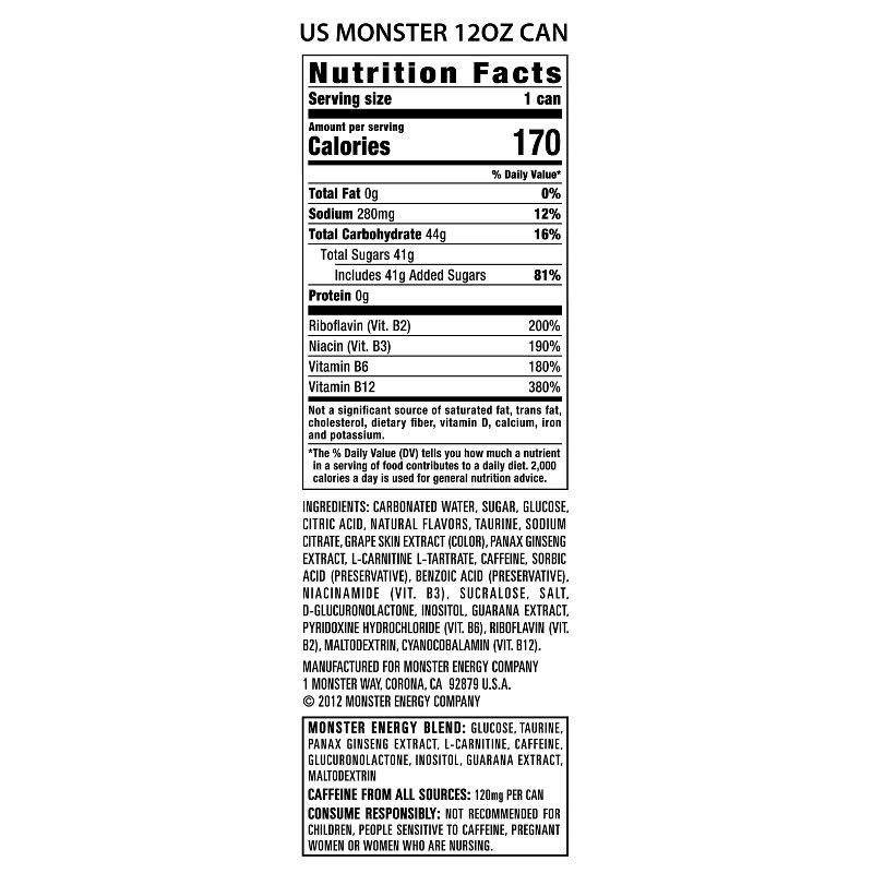 Carbonated Water, Sugar, Glucose, Citric Acid, Natural Flavors, Taurine, Sodium Citrate, Grape Skin Extract (Color), Panax Ginseng Extract, L-Carnitine L-Tartrate, Caffeine, Sorbic Acid (Preservative)…