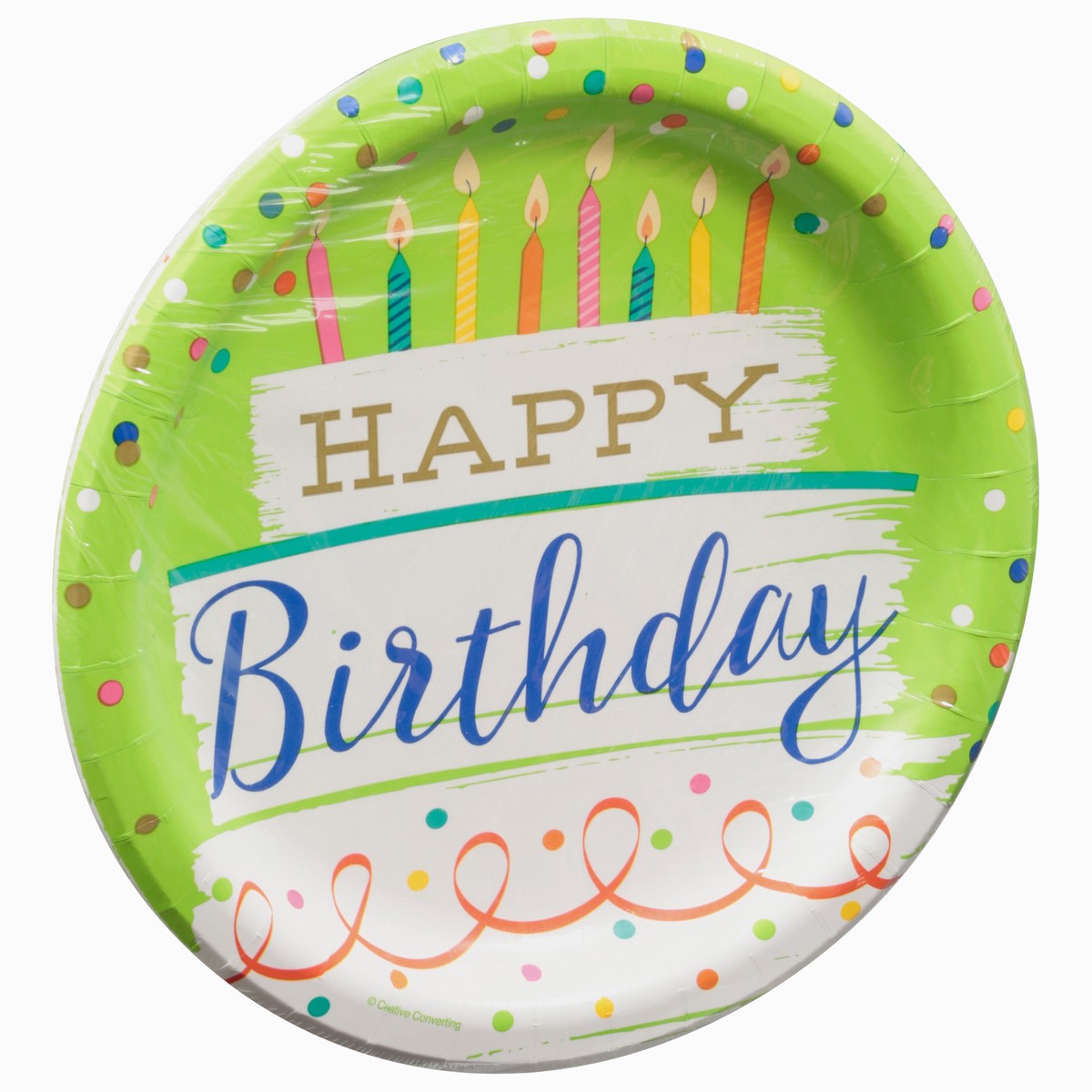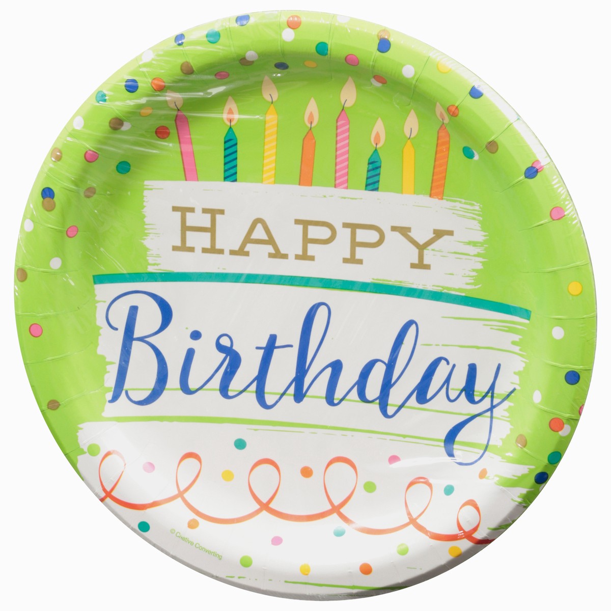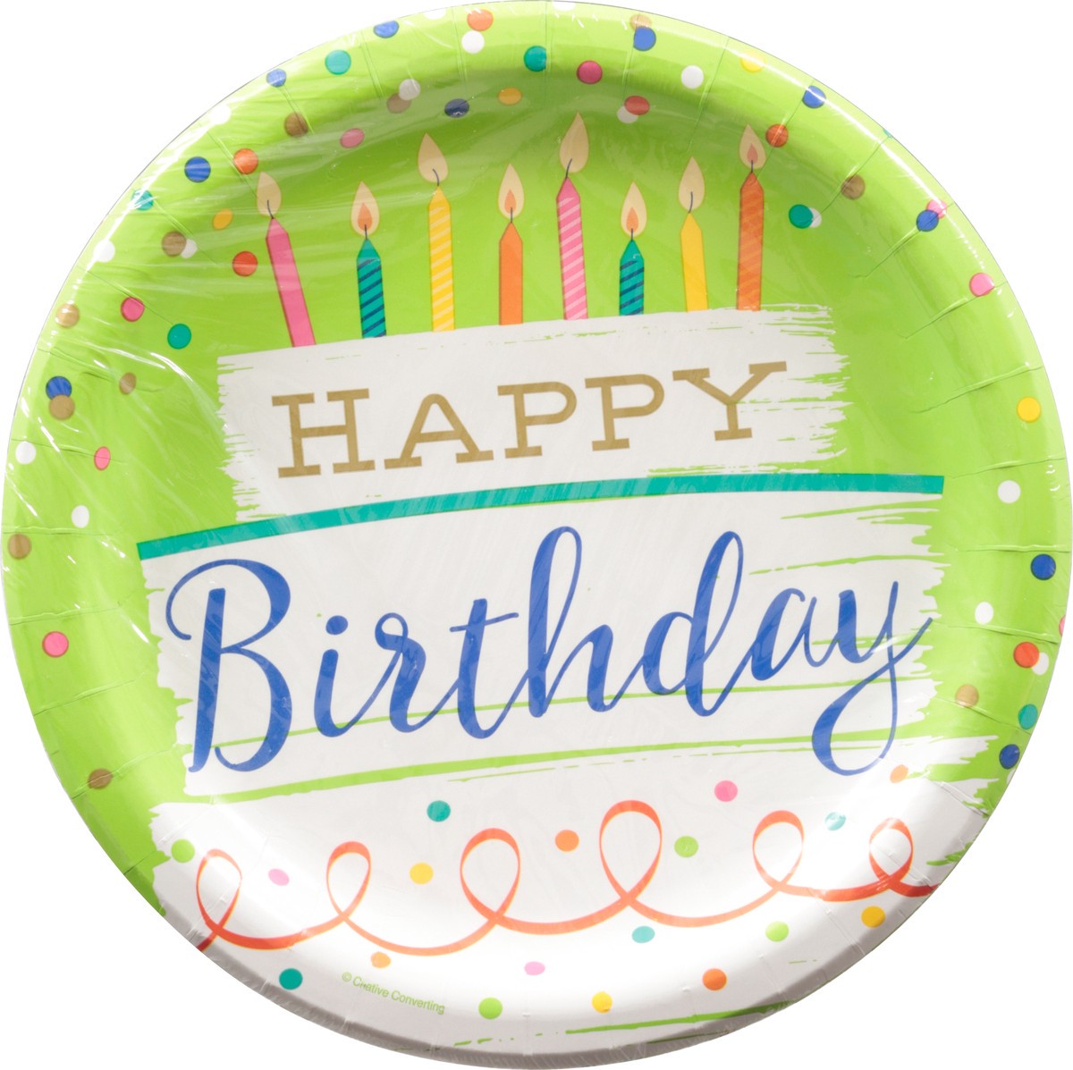 Happy birthday. Premium strength plates. Food safe. Sustainable Forestry Initiative: Certified sourcing. www.sfiprogram.org.