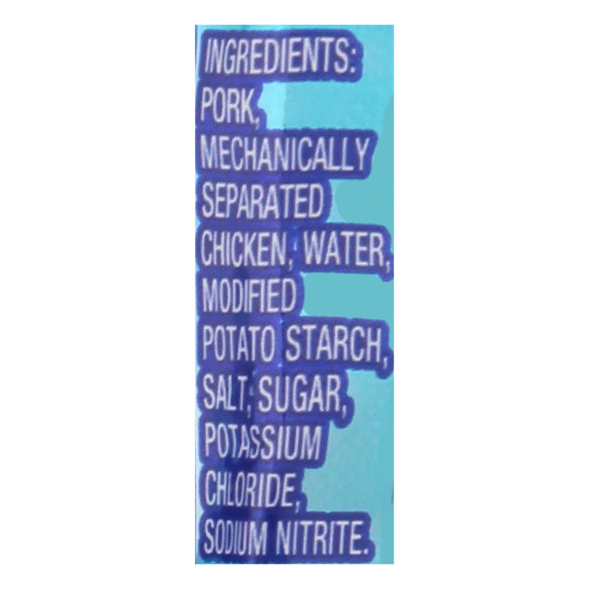 Pork, Mechanically Separated Chicken, Water, Modified Potato Starch, Salt, Sugar, Potassium Chloride, Sodium Nitrite.