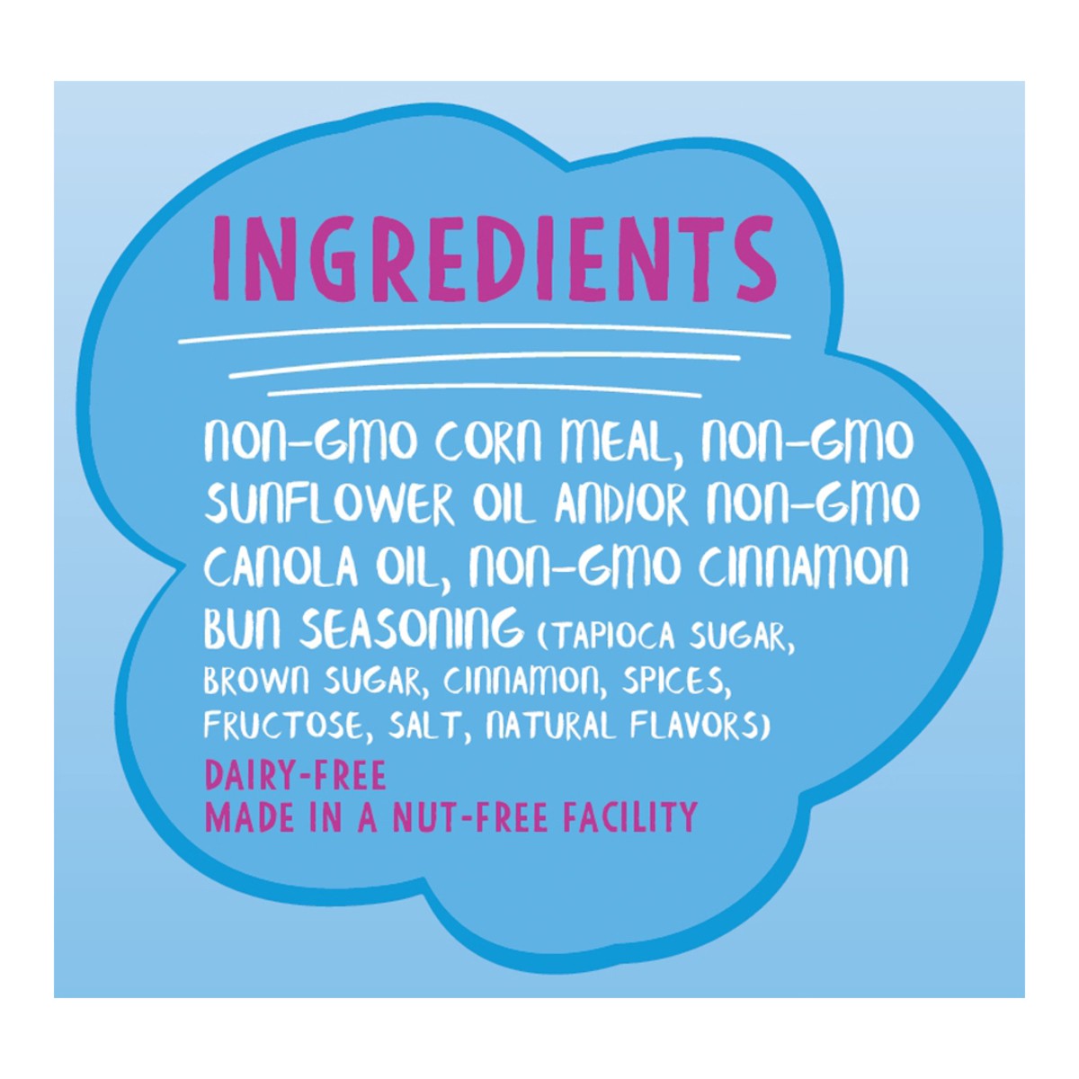 Non-GMO Corn Meal, Non-GMO Sunflower Oil and/or Non-GMO Canola Oil, Non-GMO Cinnamon Bun Seasoning (Tapioca Sugar, Brown Sugar, Cinnamon, Spices, Fructose, Salt, Natural Flavors).