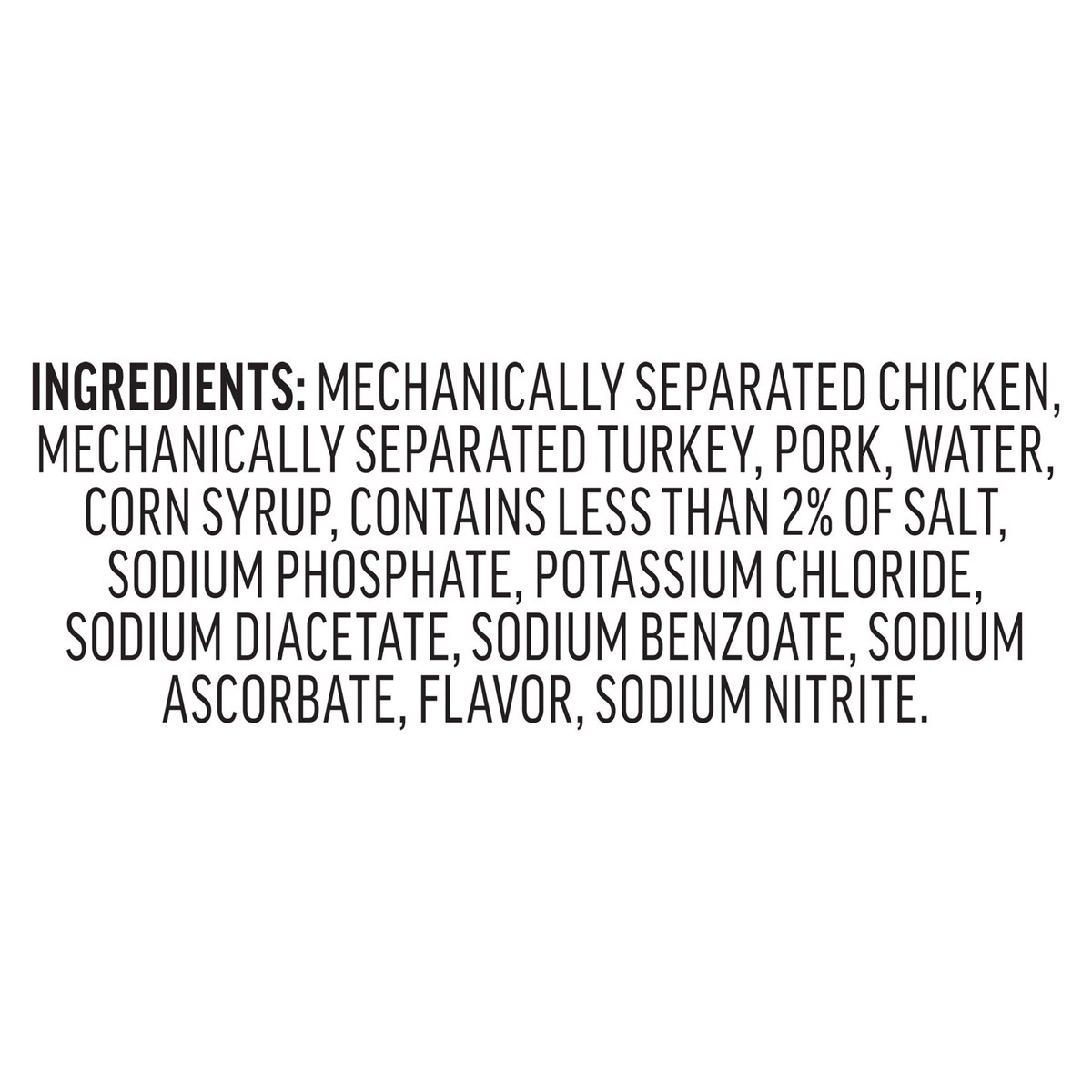 MECHANICALLY SEPARATED CHICKEN, MECHANICALLY SEPARATED TURKEY, PORK, WATER, CORN SYRUP, CONTAINS LESS THAN 2% OF SALT, SODIUM PHOSPHATE, POTASSIUM CHLORIDE, SODIUM DIACETATE, SODIUM BENZOATE, SODIUM A…
