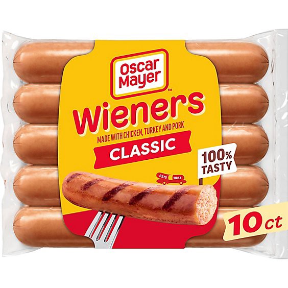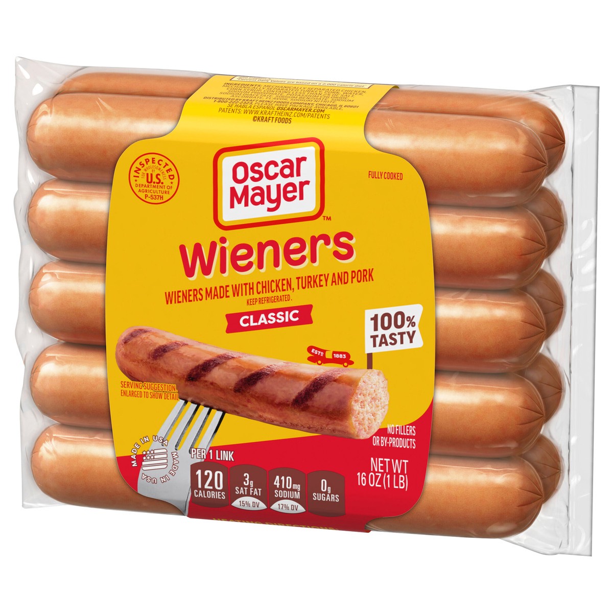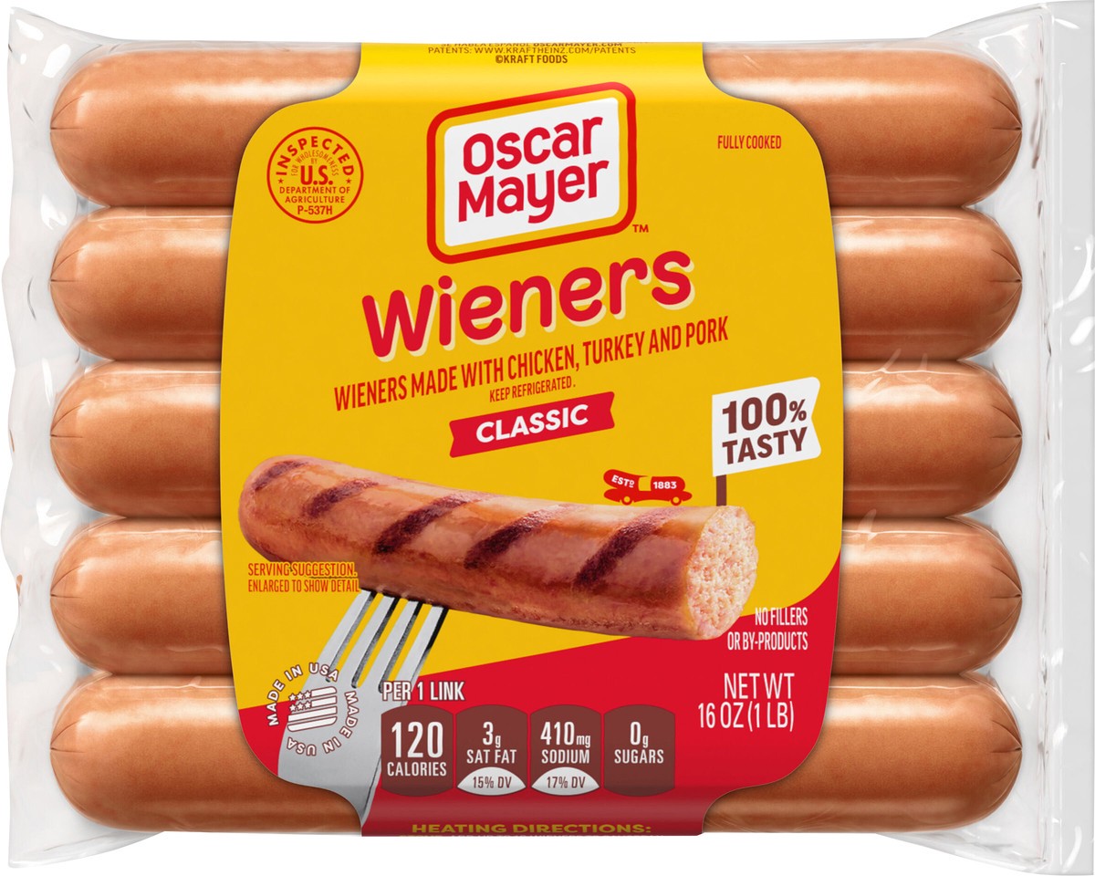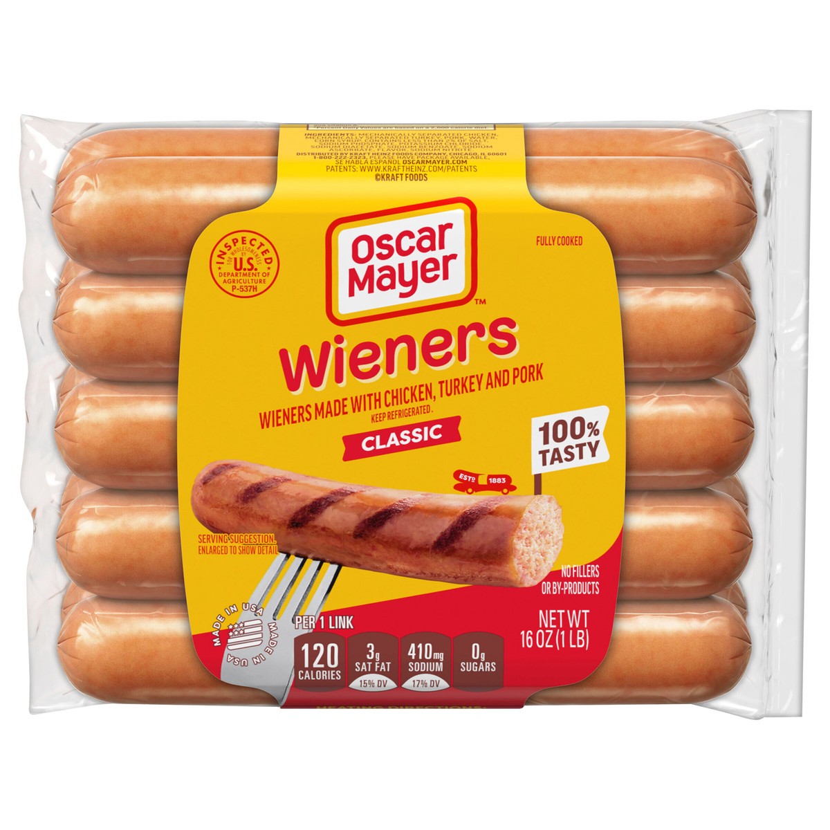 Grill up a winner with Oscar Mayer Classic Wieners Hot Dogs. Our hot dogs are 100% tasty and made with no fillers or by-products. Made with chicken, turkey and pork, our original wieners are perfect f…