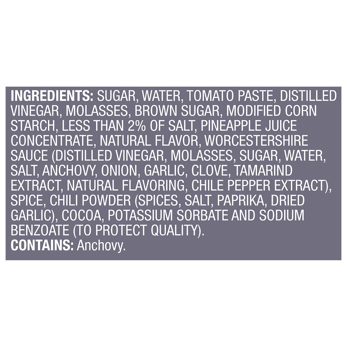 Sugar, Water, Tomato Paste, Distilled Vinegar, Molasses, Brown Sugar, Modified Corn Starch, Less than 2% of Salt, Pineapple Juice, Concentrate, Natural Flavor, Worcestershire Sauce (Distilled Vinegar,…