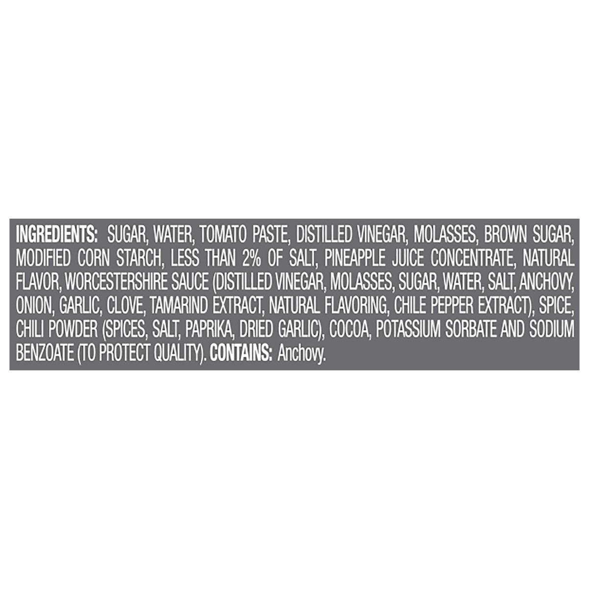 Sugar, Water, Tomato Paste, Distilled Vinegar, Molasses, Brown Sugar, Modified Corn Starch, Less than 2% of Salt, Pineapple Juice, Concentrate, Natural Flavor, Worcestershire Sauce (Distilled Vinegar,…