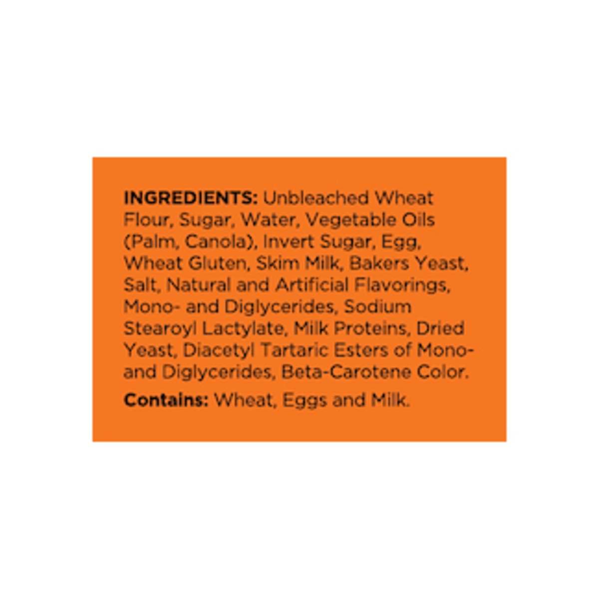Unbleached Wheat Flour, Sugar, Water, Vegetable Oils (Palm, Canola), Invert Sugar, Egg, Wheat Gluten, Skim Milk, Bakers Yeast, Salt, Natural and Artificial Flavorings, Mono- and Diglycerides, Sodium S…