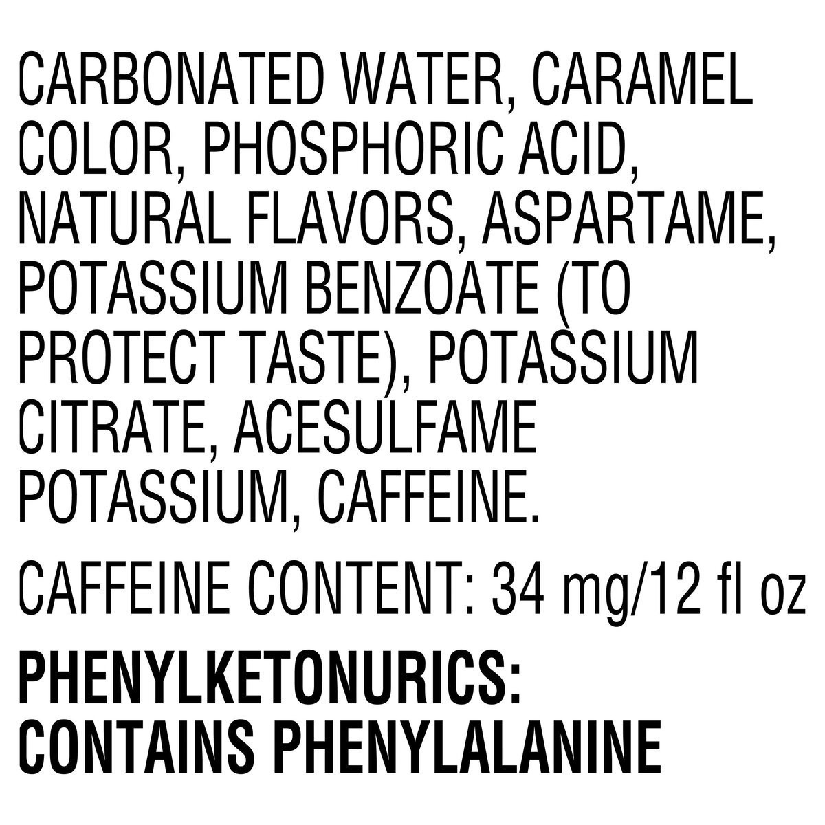 Carbonated Water, Caramel Color, Phosphoric Acid, Natural Flavors, Aspartame, Potassium Benzoate (To Protect Taste), Potassium Citrate, Acesulfame Potassium, Caffeine.