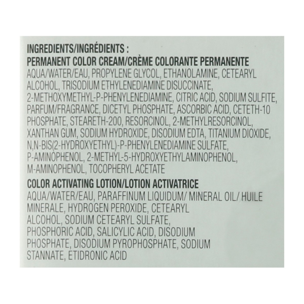 Permanent Color Cream: Aqua/Water/Eau, Propylene Glycol, Ethanolamine, Cetearyl Alcohol, Trisodium Ethylenediamine Disuccinate 2-Methoxymethyl-P-Phenylenediamine, Citric Acid, Sodium Sulfite Parfum/Fr…