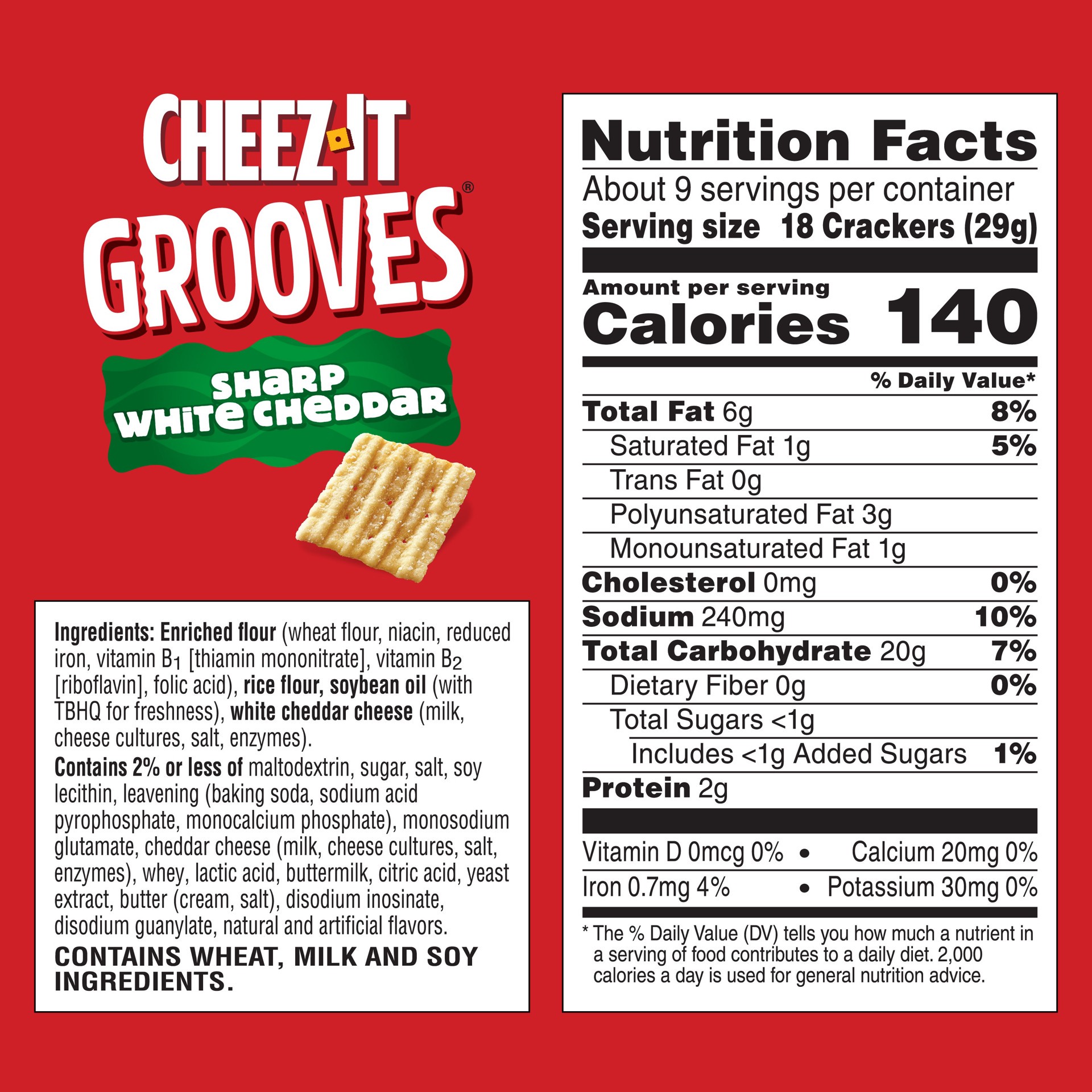 Ingredients: Enriched Flour (Wheat Flour, Niacin, Reduced Iron, Vitamin B1 [Thiamin Mononitrate], Vitamin B2 [Riboflavin], Folic Acid), Rice Flour, Soybean Oil (With Tbhq For Freshness), White Cheddar…