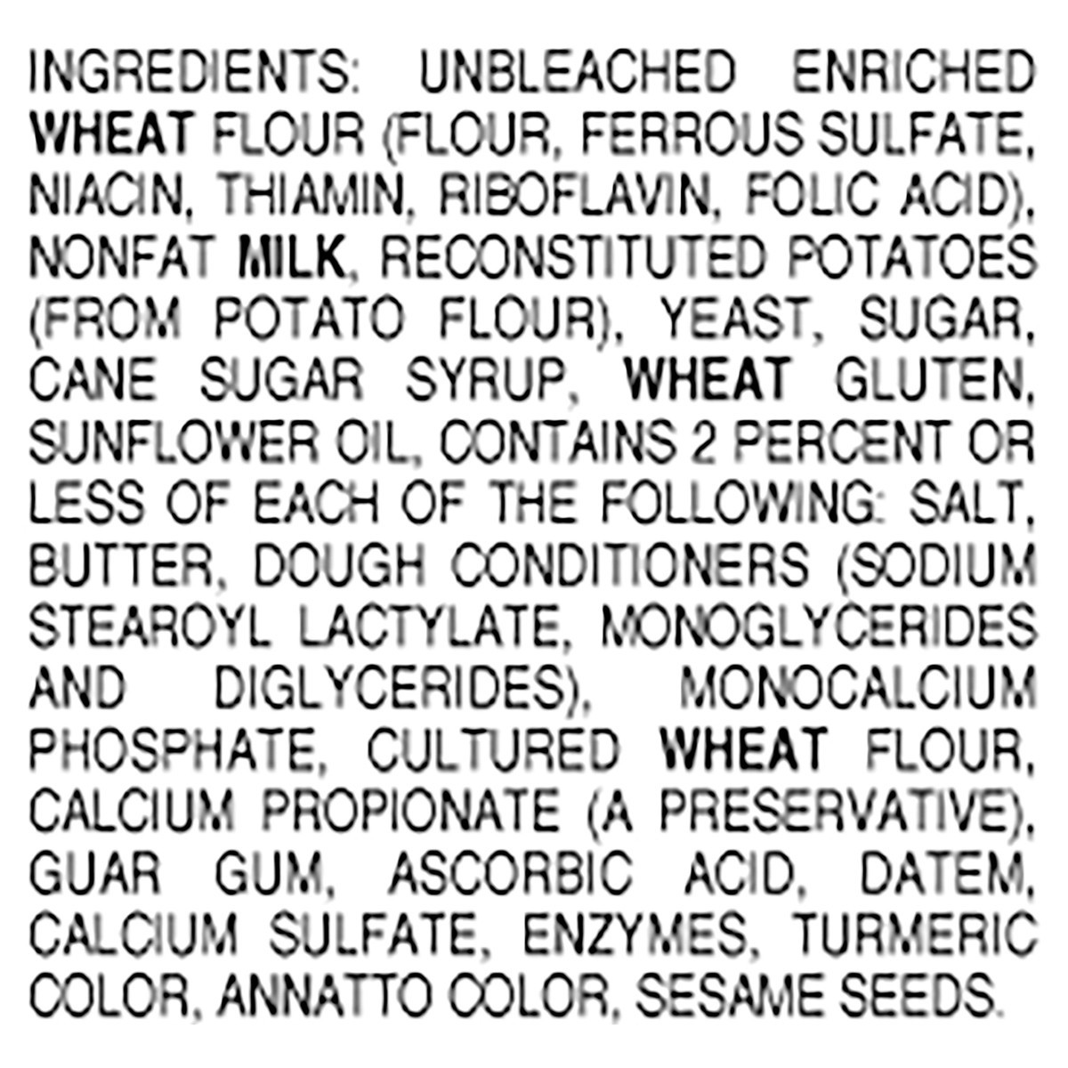 Unbleached Enriched Wheat Flour (Flour, Ferrous Sulfate, Niacin, Thiamin, Riboflavin, Folic Acid), Nonfat Milk, Reconstituted Potatoes (from: Potato Flour), Yeast, Sugar, Wheat Gluten, Sunflower Oil, …