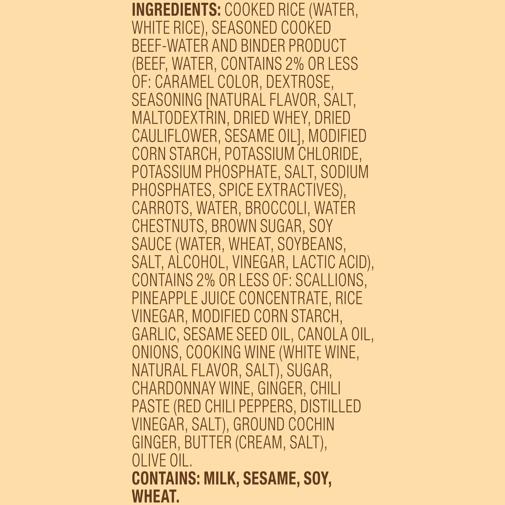 COOKED RICE (WATER, WHITE RICE), SEASONED COOKED BEEF AND BINDER PRODUCT (BEEF, WATER, CONTAINS 2% OR LESS OF: CARAMEL COLOR, DEXTROSE, SEASONING [NATURAL FLAVOR, SALT, MALTODEXTRIN, DRIED WHEY, DRIED…