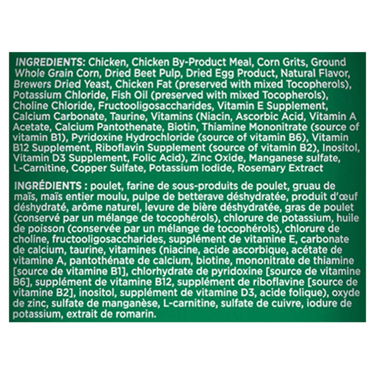 Chicken, Chicken By-Product Meal, Corn Grits, Ground Whole Grain Corn, Dried Plain Beet Pulp, Dried Egg Product, Brewers Dried Yeast, Natural Flavor, Chicken Fat (Preserved with Mixed Tocopherols), Po…