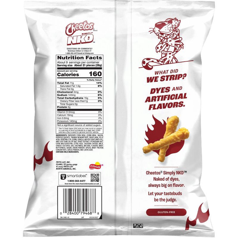 - Includes 1 (8.5 oz) bag of Cheetos Simply NKD Naked Flamin' Hot Crunchy with no dyes and no artificial flavors.