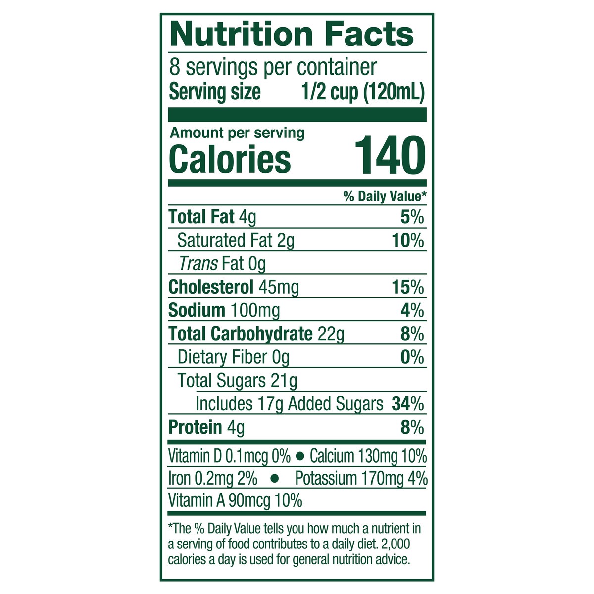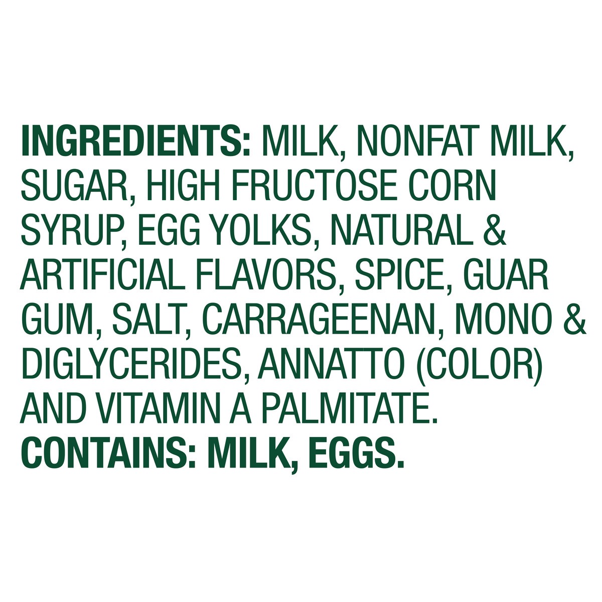 Milk, Nonfat Milk, Sugar, High Fructose Corn Syrup, Egg Yolks, Natural & Artificial Flavors, Spice, Guar Gum, Salt, Carrageenan, Mono & Diglycerides, Annatto (Color) and Vitamin A Palmitate.