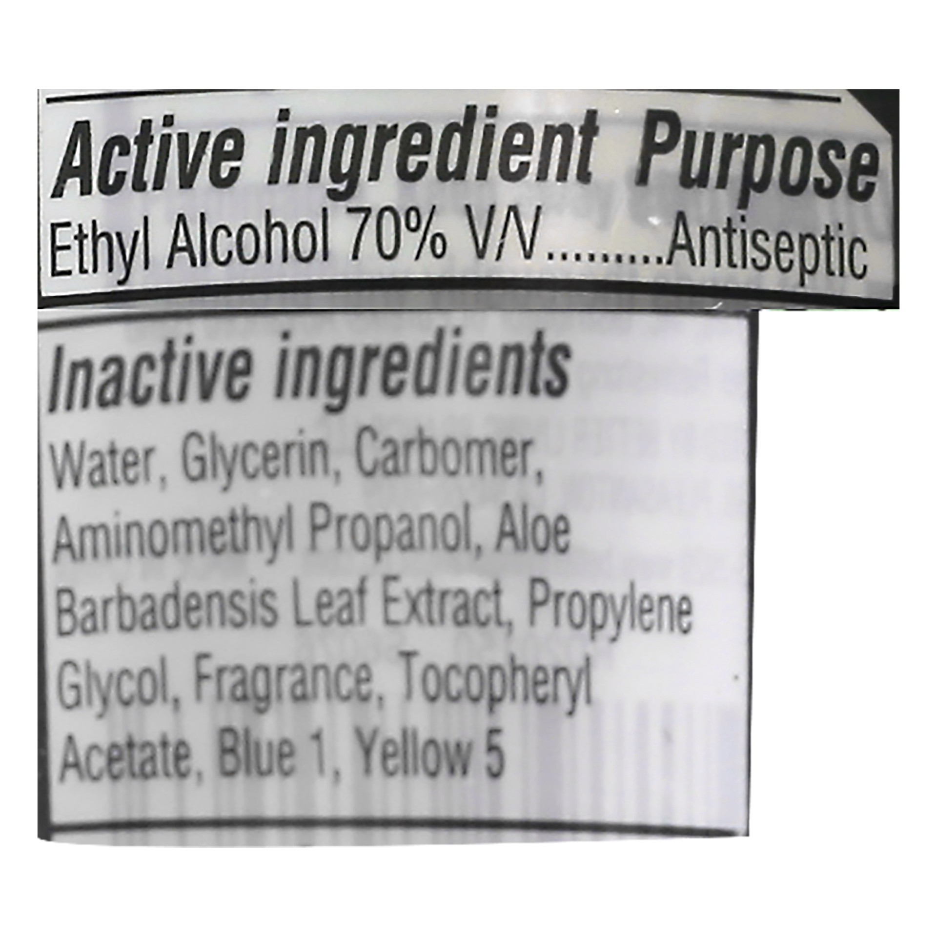 Active Ingredients: Ethanol Alcohol v/v (70 %), Antiseptic. Inactive Ingredients: Water, Glycerin, Carbomer, Aminomethyl Propanol, Aloe Barbadensis Leaf Juice Extract, Propylene Glycol, Fragrance, Toc…