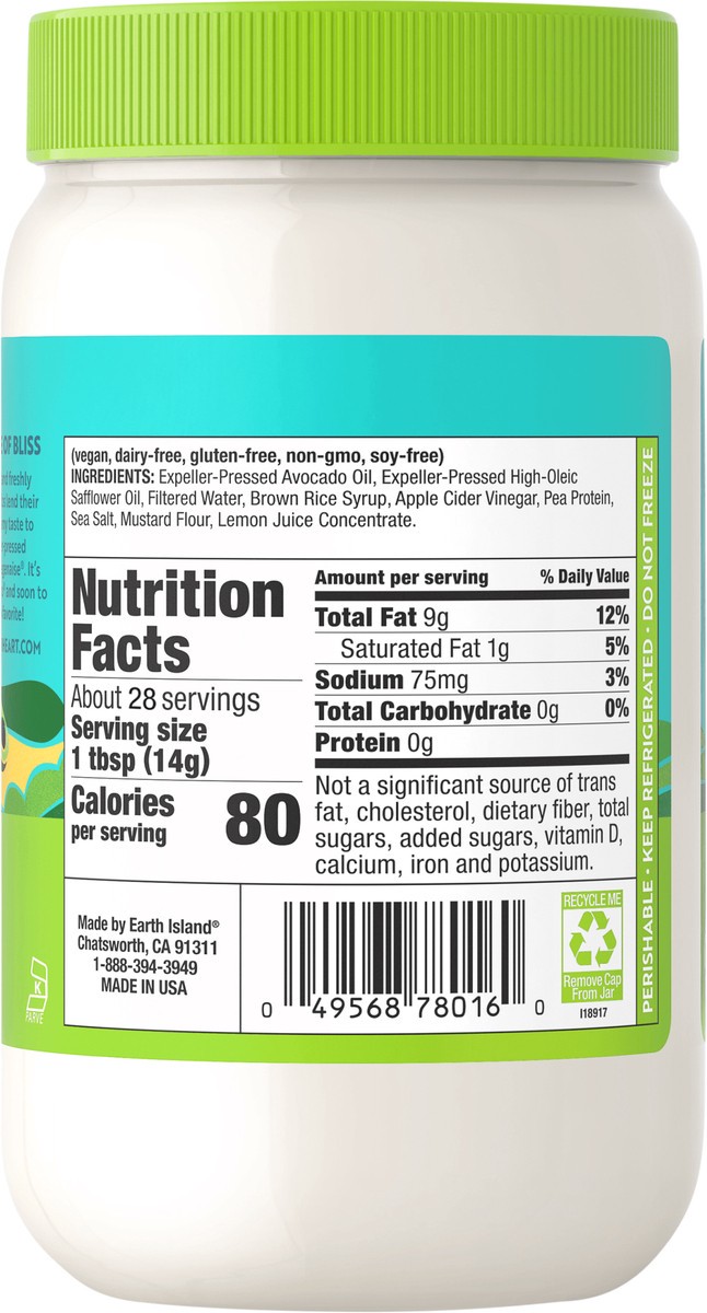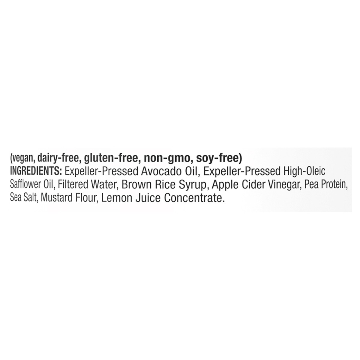 Expeller-Pressed Avocado Oil, Expeller-Pressed High-Oleic Safflower Oil, Filtered Water, Brown Rice Syrup, Apple Cider Vinegar, Pea Protein, Sea Salt, Mustard Flour, Lemon Juice Concentrate.
