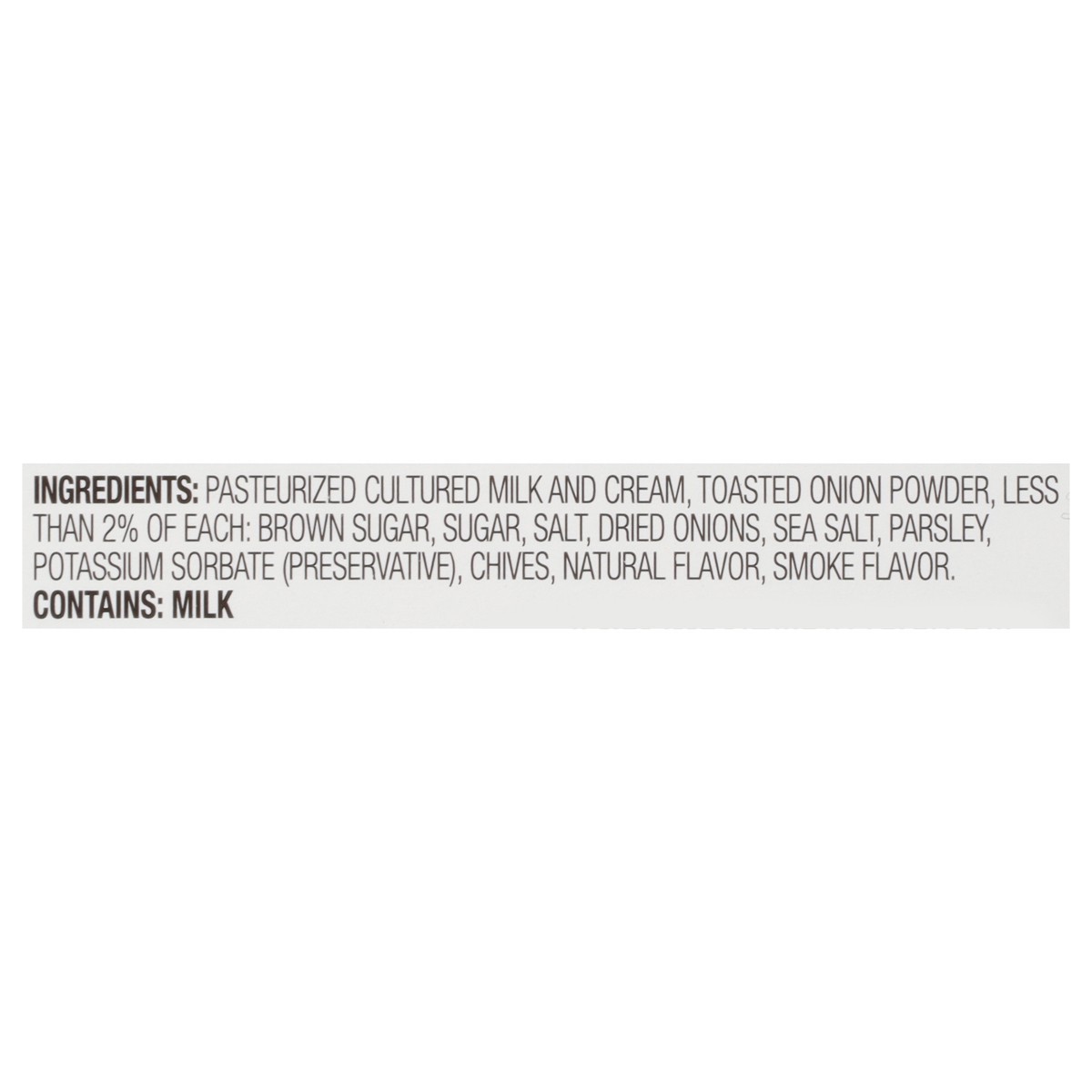 Pasteurized Cultured Milk and Cream, Toasted Onion Powder, Less than 2% of Each: Brown Sugar, Sugar, Salt, Dried Onions, Sea Salt, Parsley, Potassium Sorbate (Preservative), Dried Chives, Natural Flav…