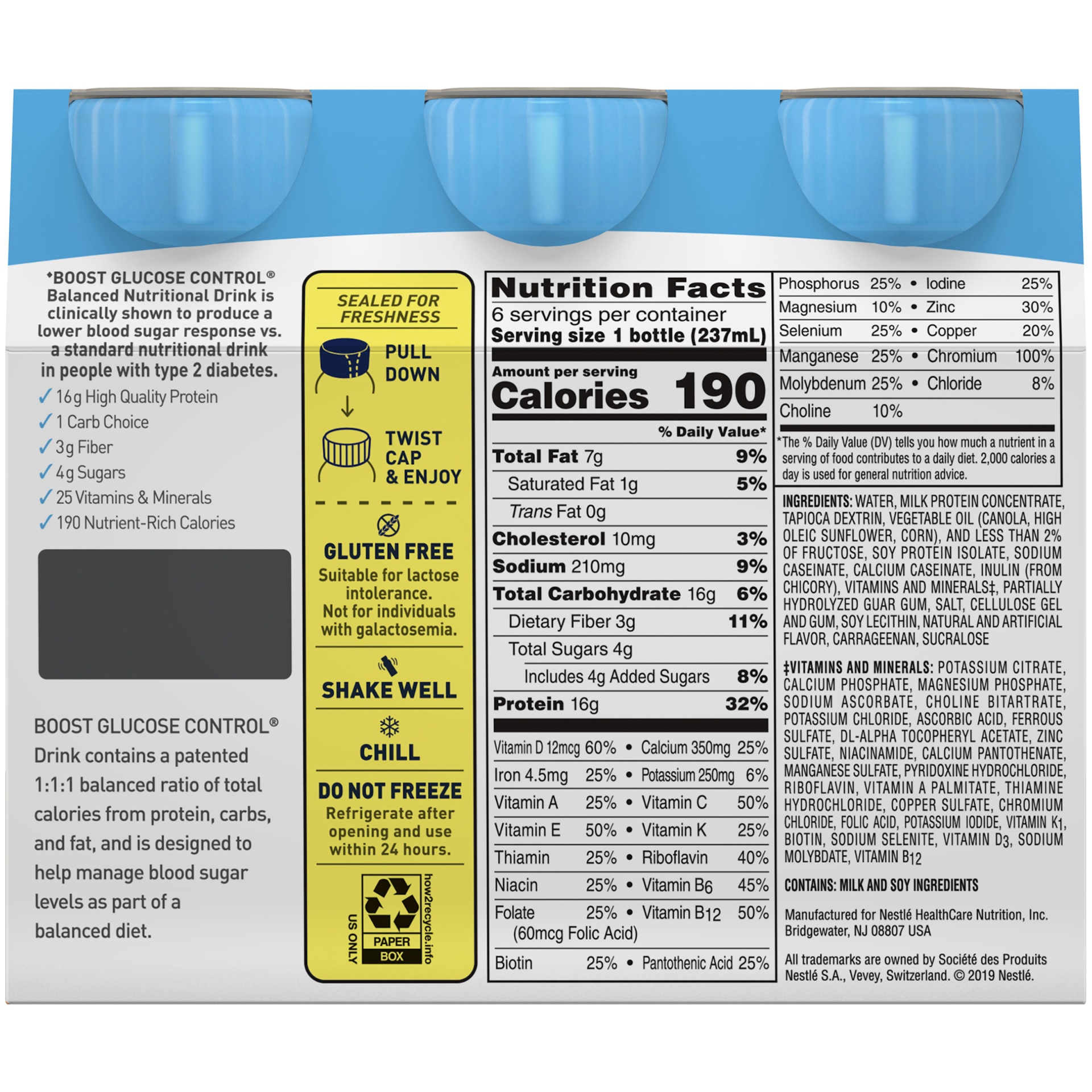 - BOOST GLUCOSE CONTROL Drink can be used as convenient mini-meal or snack. It provides balanced nutrition with 190 calories and 16 g of protein to help manage hunger. Its is a great choice if you're managing your carb intake.