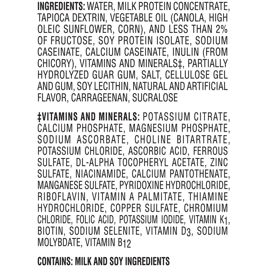 WATER, MILK PROTEIN CONCENTRATE, TAPIOCA DEXTRIN, CANOLA OIL, AND LESS THAN 2% OF FRUCTOSE, SOY PROTEIN ISOLATE, CALCIUM CASEINATE, SODIUM CASEINATE, FRUCTOOLIGOSACCHARIDES, VITAMINS AND MINERALS*, PA…
