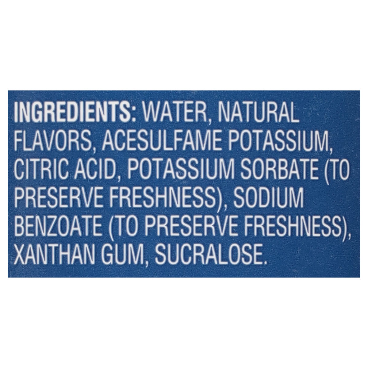 Water, Natural Flavors, Acesulfame Potassium, Citric Acid, Potassium Sorbate (to Preserve Freshness), Sodium Benzoate (to Preserve Freshness), Xanthan Gum, Sucralose.