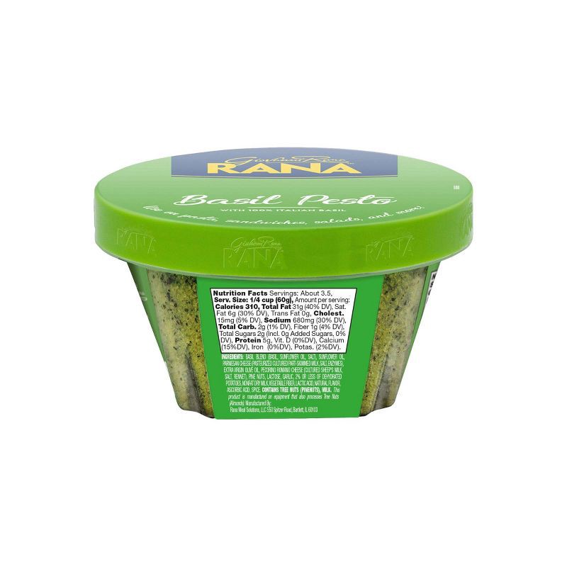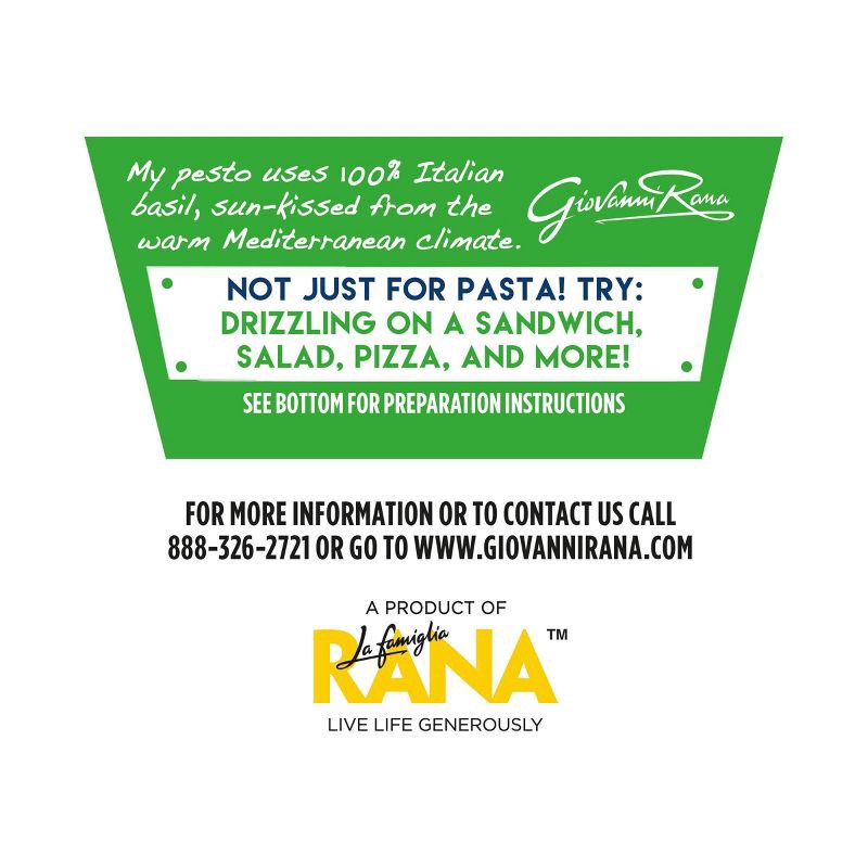 Refrigerated Rana Pesto made with 100% Italian basil. My pesto uses 100% Italian basil, sun-kissed from the warm Mediterranean climate. - Giovanni Rana. Use on pasta, sandwiches, salads, and more!