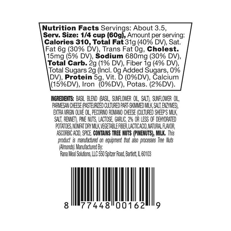 BASIL BLEND (BASIL, SUNFLOWER OIL, SALT), SUNFLOWER OIL, PARMESAN CHEESE (PASTEURIZED CULTURED PART-SKIMMED MILK, SALT, ENZYMES), EXTRA VIRGIN OLIVE OIL, PECORINO ROMANO CHEESE (CULTURED SHEEP'S MILK,…