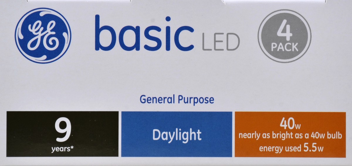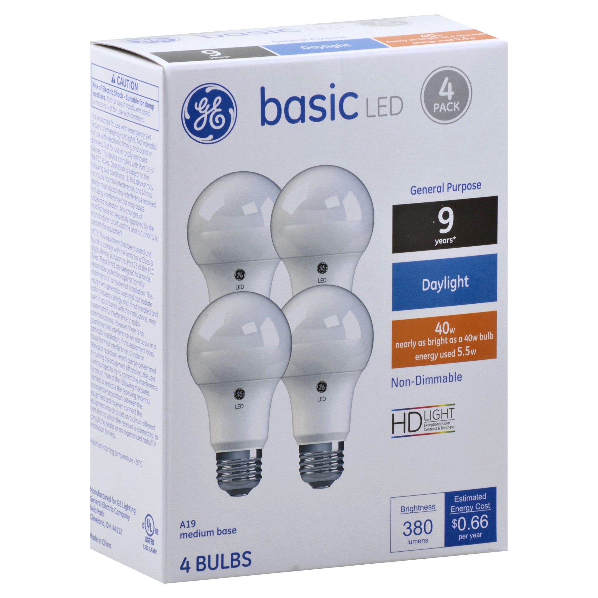 Brightness Quality: 380 Lumens. Energy Info: $0.66 based on 3 hrs/day, 11 cents/kWh. Cost depends on rates and use. 5.5 Watts. Package Info: 4-Pack 4 Bulb Info: LED Medium. Bulb Life: 9.1 Years based …
