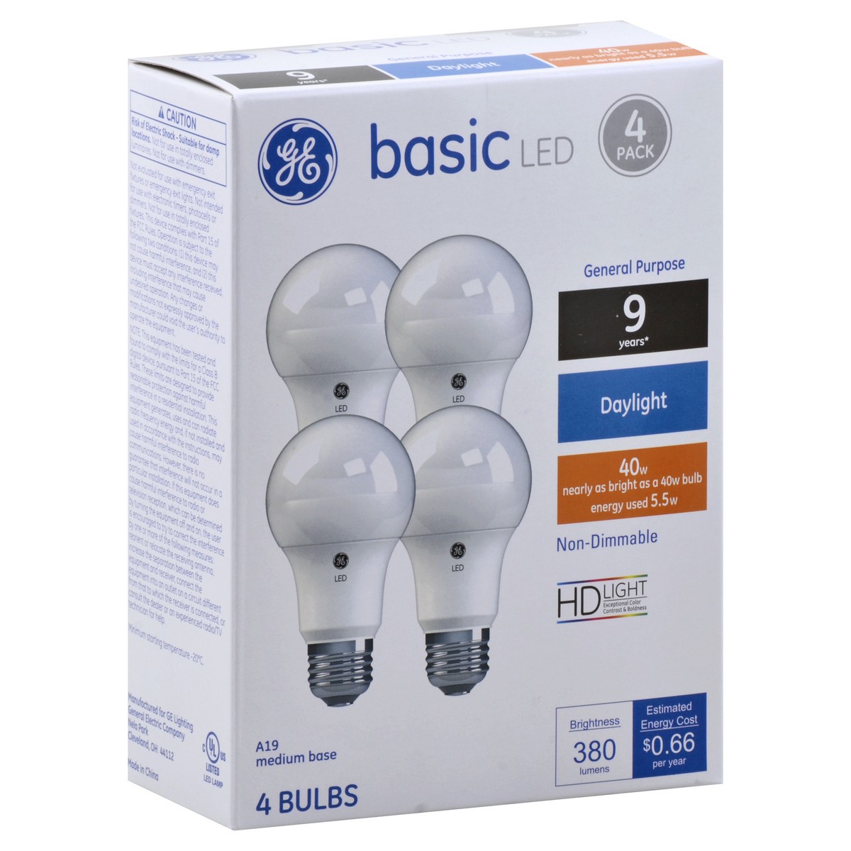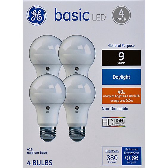 Brightness Quality: 380 Lumens. Energy Info: $0.66 based on 3 hrs/day, 11 cents/kWh. Cost depends on rates and use. 5.5 Watts. Package Info: 4-Pack 4 Bulb Info: LED Medium. Bulb Life: 9.1 Years based …