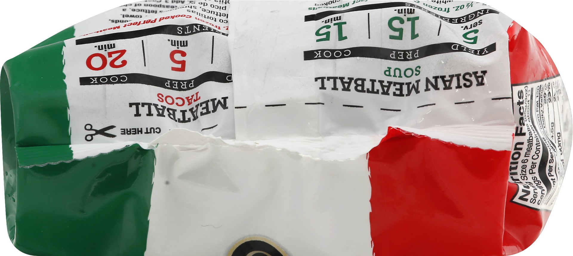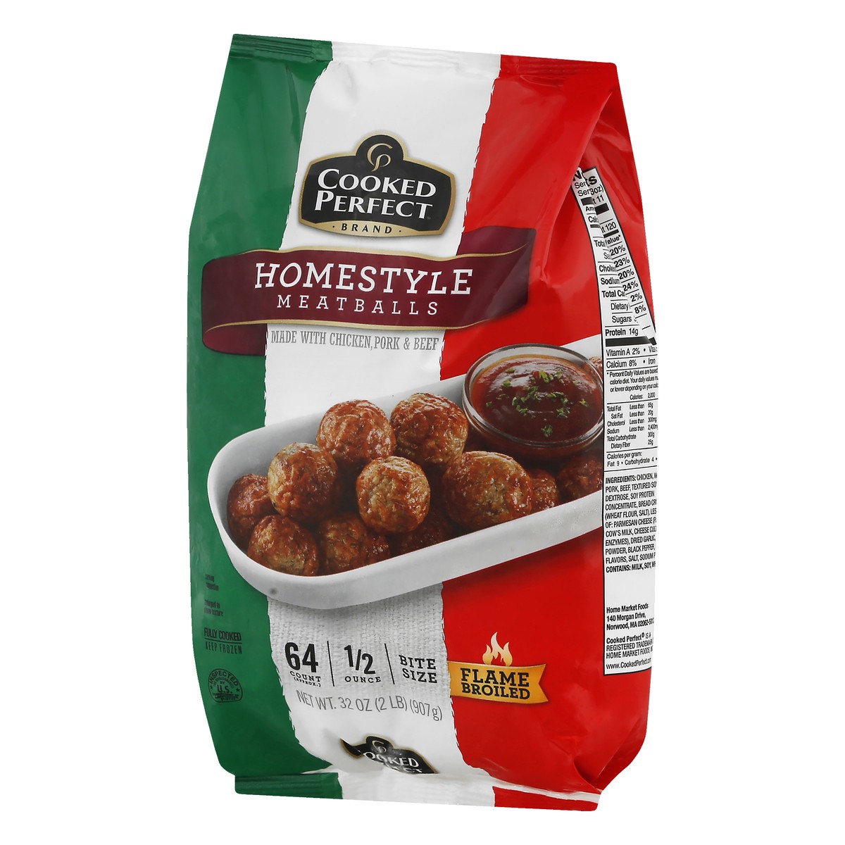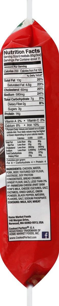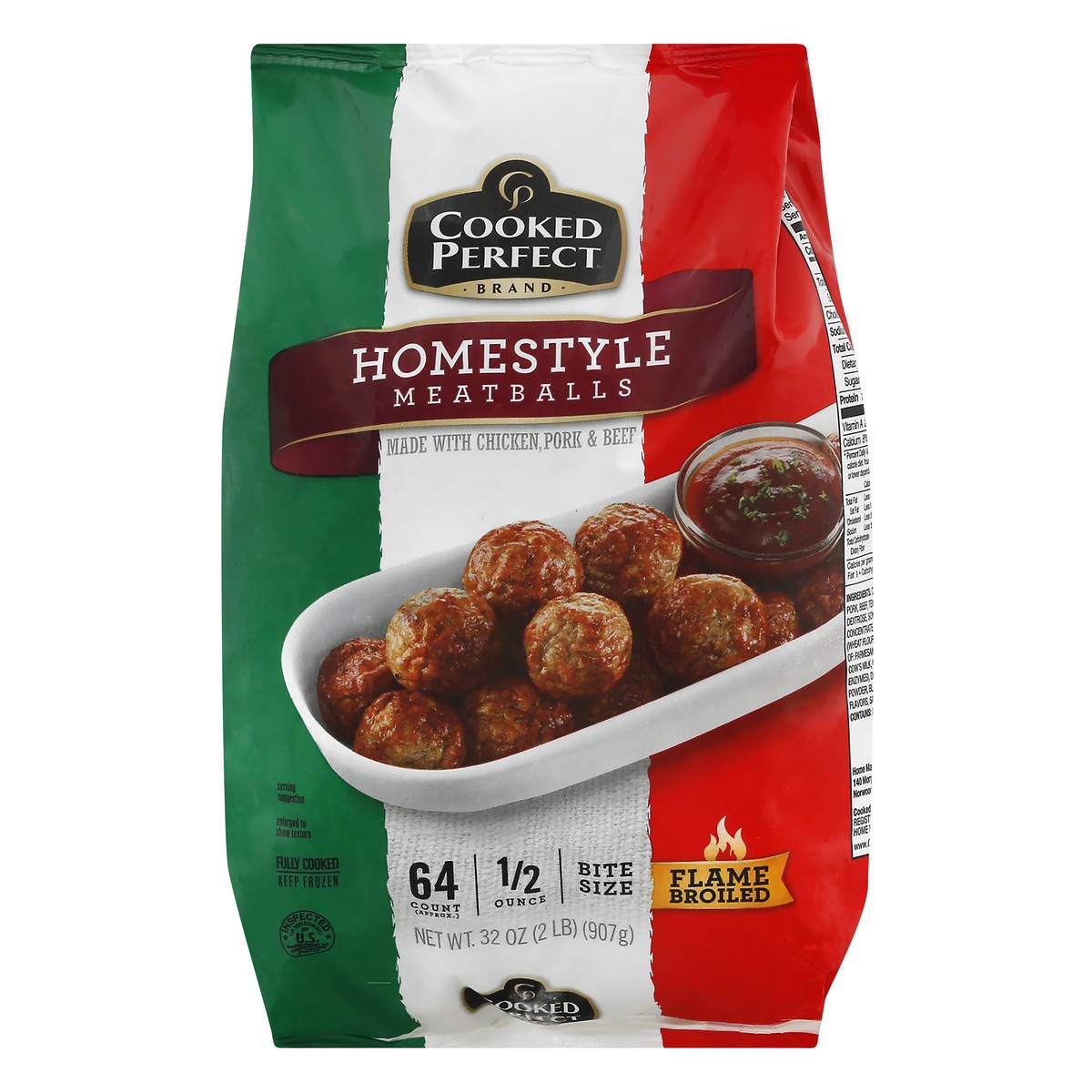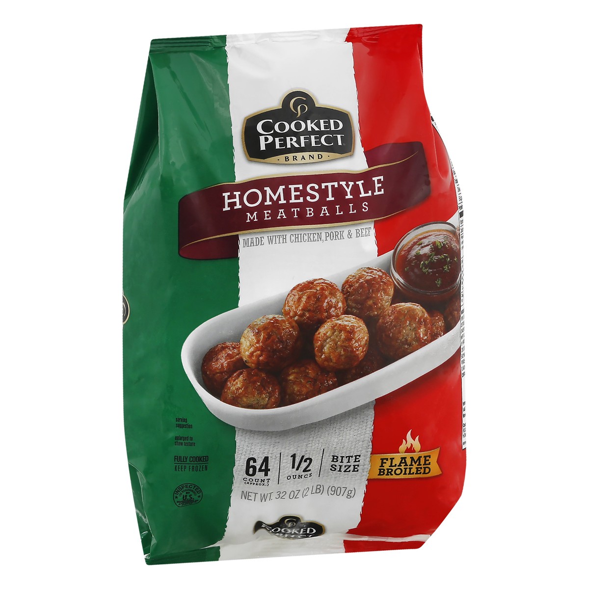 Made with chicken, pork & beef. Fully cooked. 64 count (approx); 1/2 ounce. Flame broiled. Inspected for wholesomeness by US Department of Agriculture. www.cookedperfect.com Facebook.