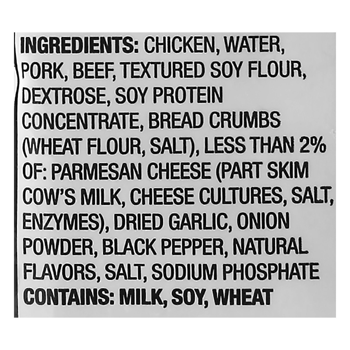 Chicken, Water, Pork, Beef, Textured Soy Flour, Dextrose, Soy Flour, Dextrose, Soy Protein Concentrate, Bread Crumbs, (Wheat Flour, Salt), Less than 2% of: Parmesan Cheese (Part Skim Cow's Milk, Chees…