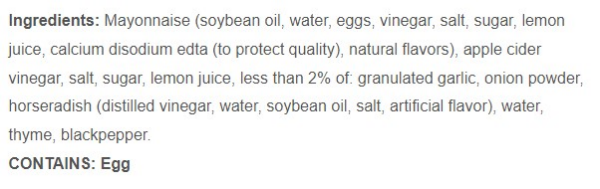 Soybean Oil, Water, Egg Yolk, Distilled Vinegar, Sugar, Salt, Dehydrated Garlic and Onion, Spices, Apple Cider Vinegar, Horseradish (with Artificial Flavor), Lemon Juice Concentrate, Modified Food Sta…