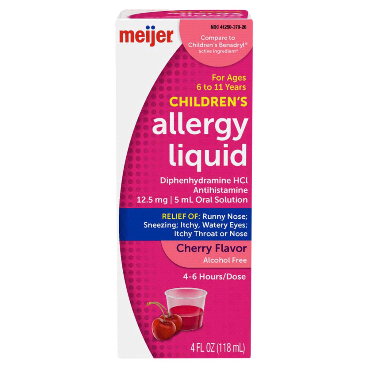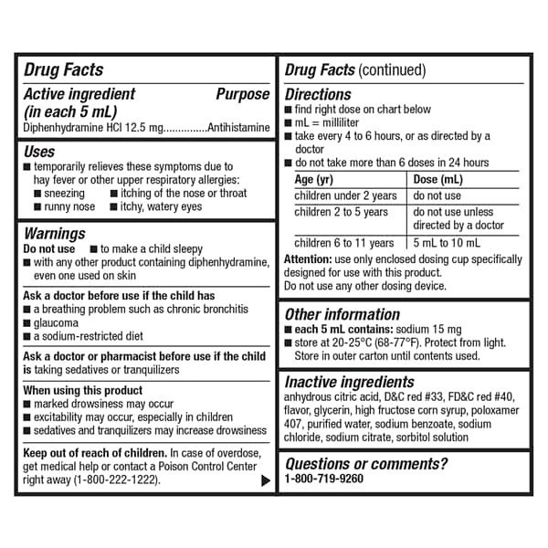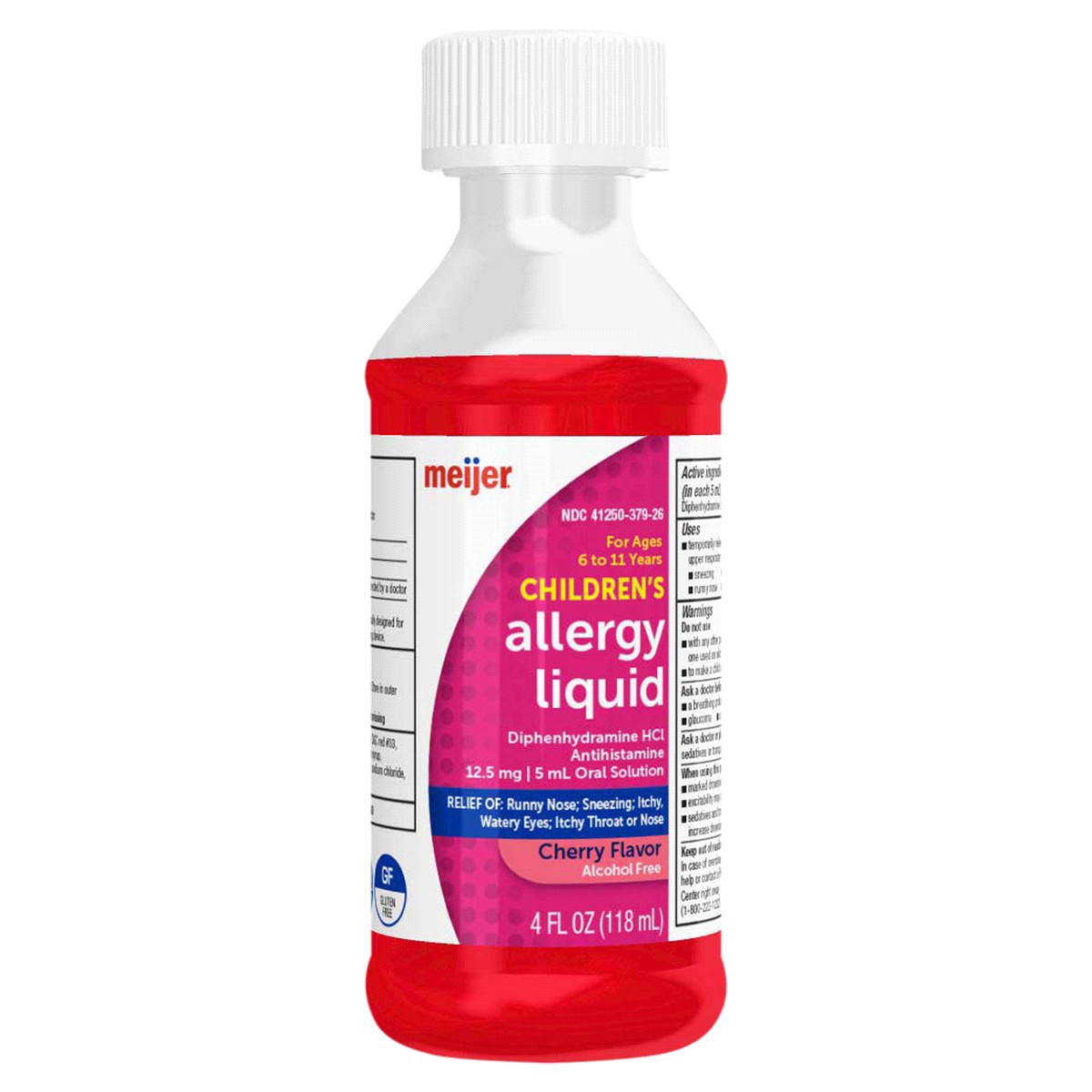 Compare to Childrens Benadryl Allergy Liquid active ingredient. Children's Allergy Liquid, Cherry Flavor, active ingredient is Diphenhydramine HCI, 12.5 mg in each 5 mL, an antihistamine. This product…