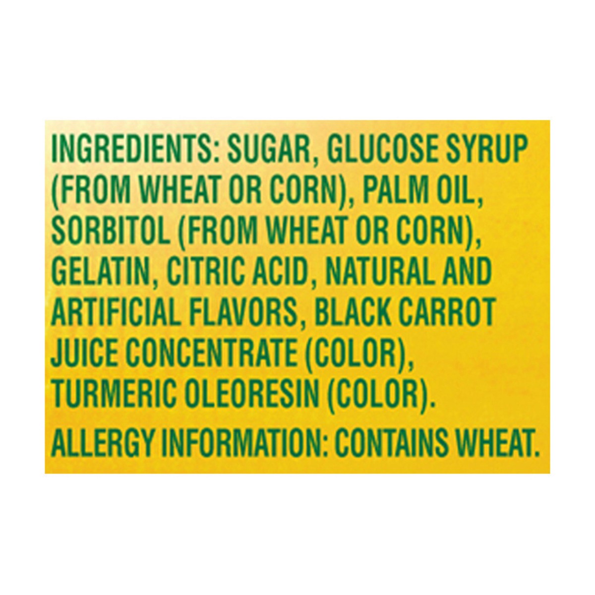 Sugar, Glucose Syrup (from Wheat or Corn), Palm Oil, Sorbitol (from Wheat or Corn), Gelatin, Citric Acid, Natural and Artificial Flavors, Black Carrot Juice Concentrate (Color), Turmeric Oleoresin (Co…