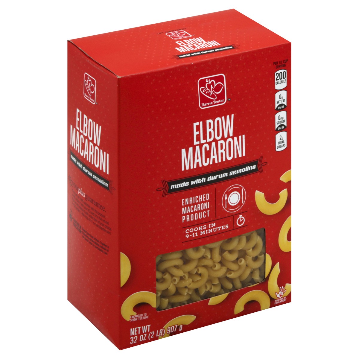 Enriched macaroni product. Made with durum semolina. Cooks in 9-11 minutes. Per 2 oz Serving: 200 calories; 0 g sat fat (0% DV); 0 mg sodium (0% DV); 2 g total sugars. Together in Education. Together …