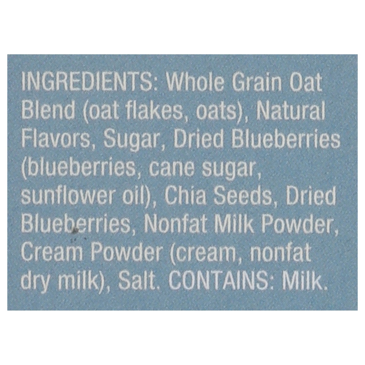 Whole Grain Oat Blend (Oat Flakes, Oats), Natural Flavors, Sugar, Dried Blueberries (Blueberries, Cane Sugar, Sunflower Oil), Chia Seeds, Dried Blueberries, Nonfat Milk Powder, Cream Powder (Cream, No…