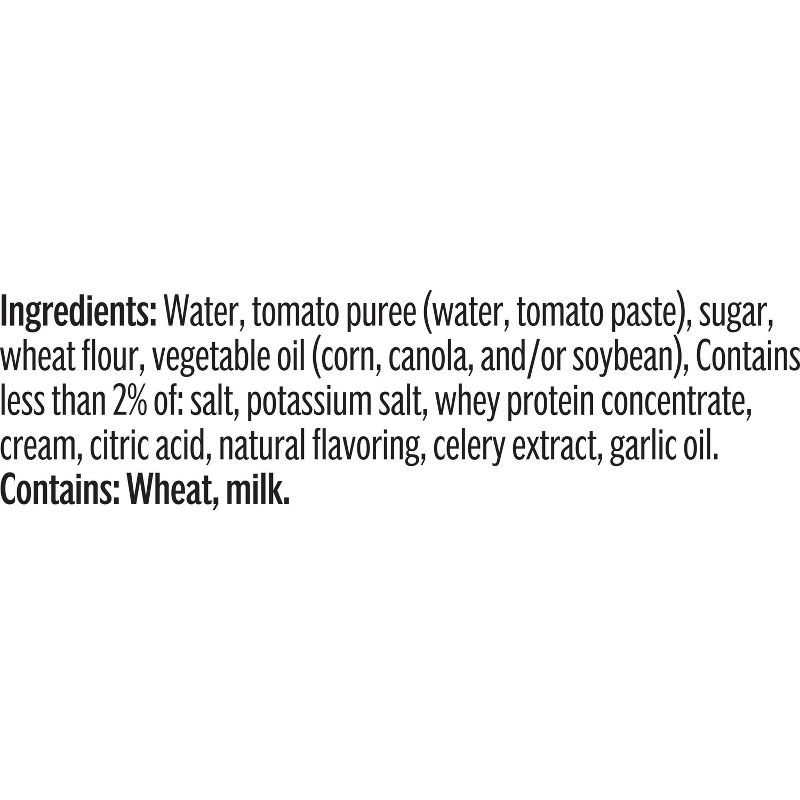 Water, Tomato Puree (Water, Tomato Paste), Sugar, Wheat Flour, Vegetable Oil (Corn, Canola, and/or Soybean), Contains Less than 2% of: Salt, Potassium Salt, Whey Protein Concentrate, Cream, Citric Aci…