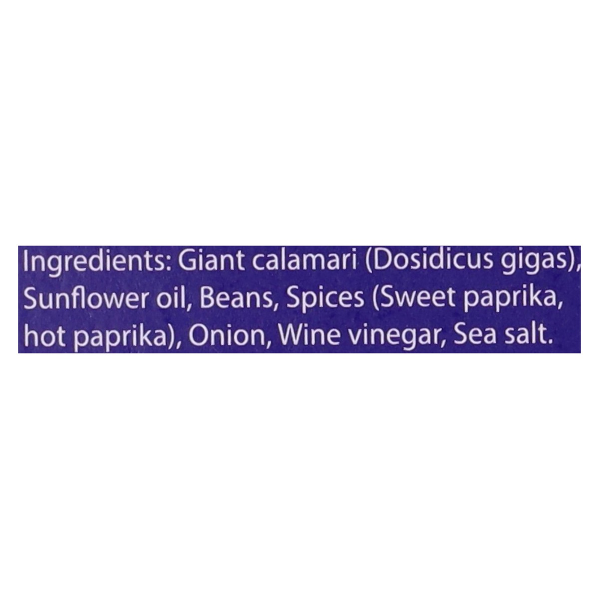 Giant Calamari (Dosidicus Gigas), Sunflower Oil, Beans, Spices (Sweet Paprika, Hot Paprika), Onion, Wine Vinegar, Sea Salt.