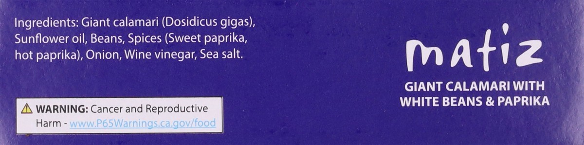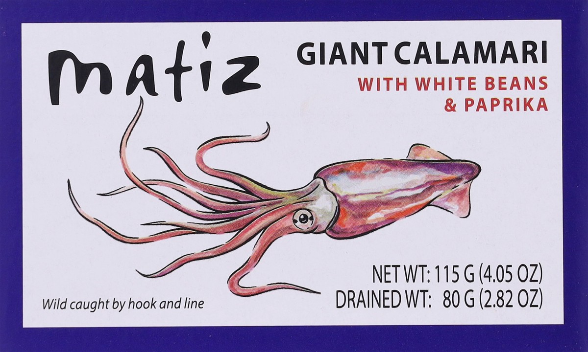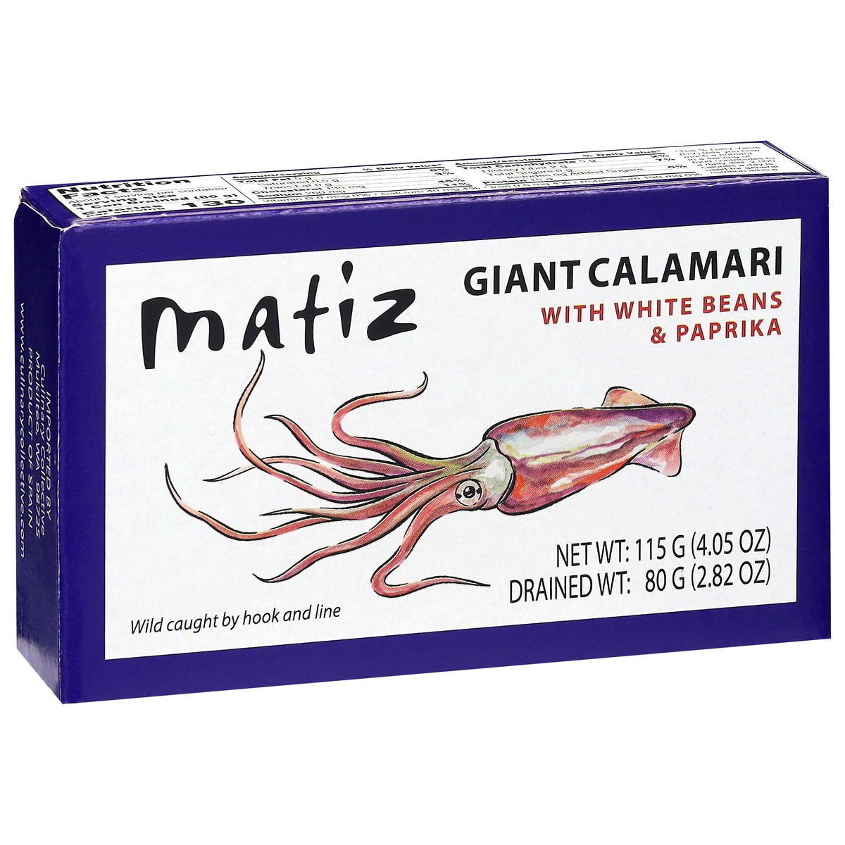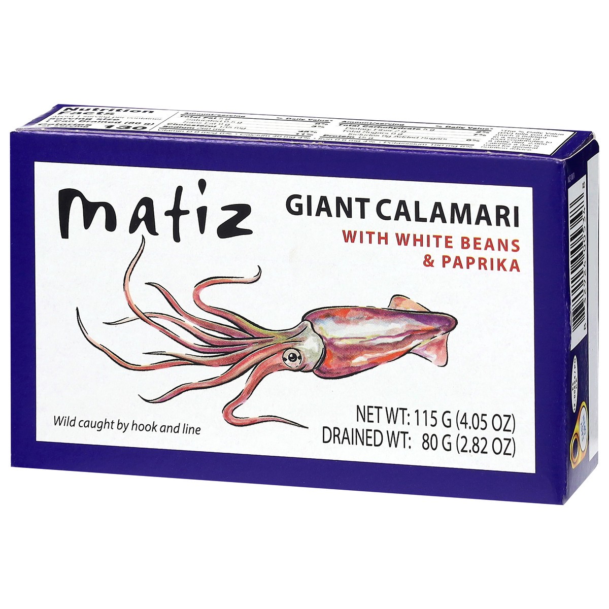 Matiz Giant Calamari with White Beans & Pimenton are firm, meaty tentacles and creamy white beans are dressed in Spanish paprika and olive oil. Wild caught by hook and line. Serve with crusty bread, o…