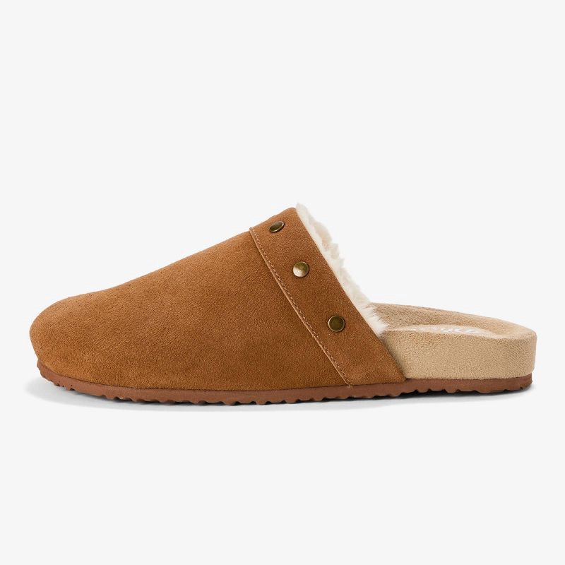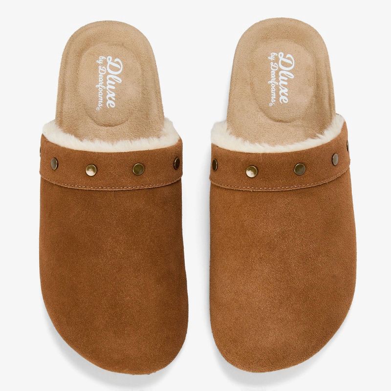 A modern twist on a classic clog, the Dluxe by Dearfoams Imogen Studded Clog pairs genuine suede with subtle stud detailing for a clean, confident look. The soft lining and cushioned insole offer gent…