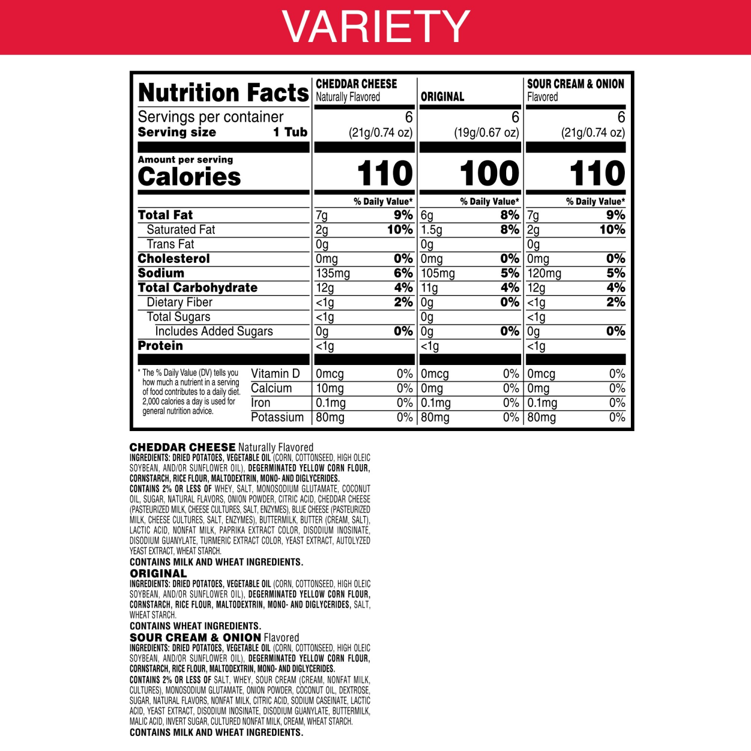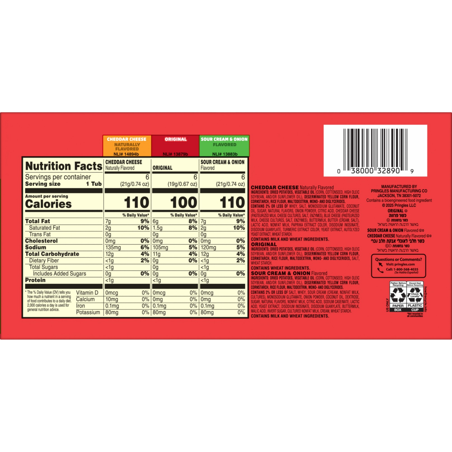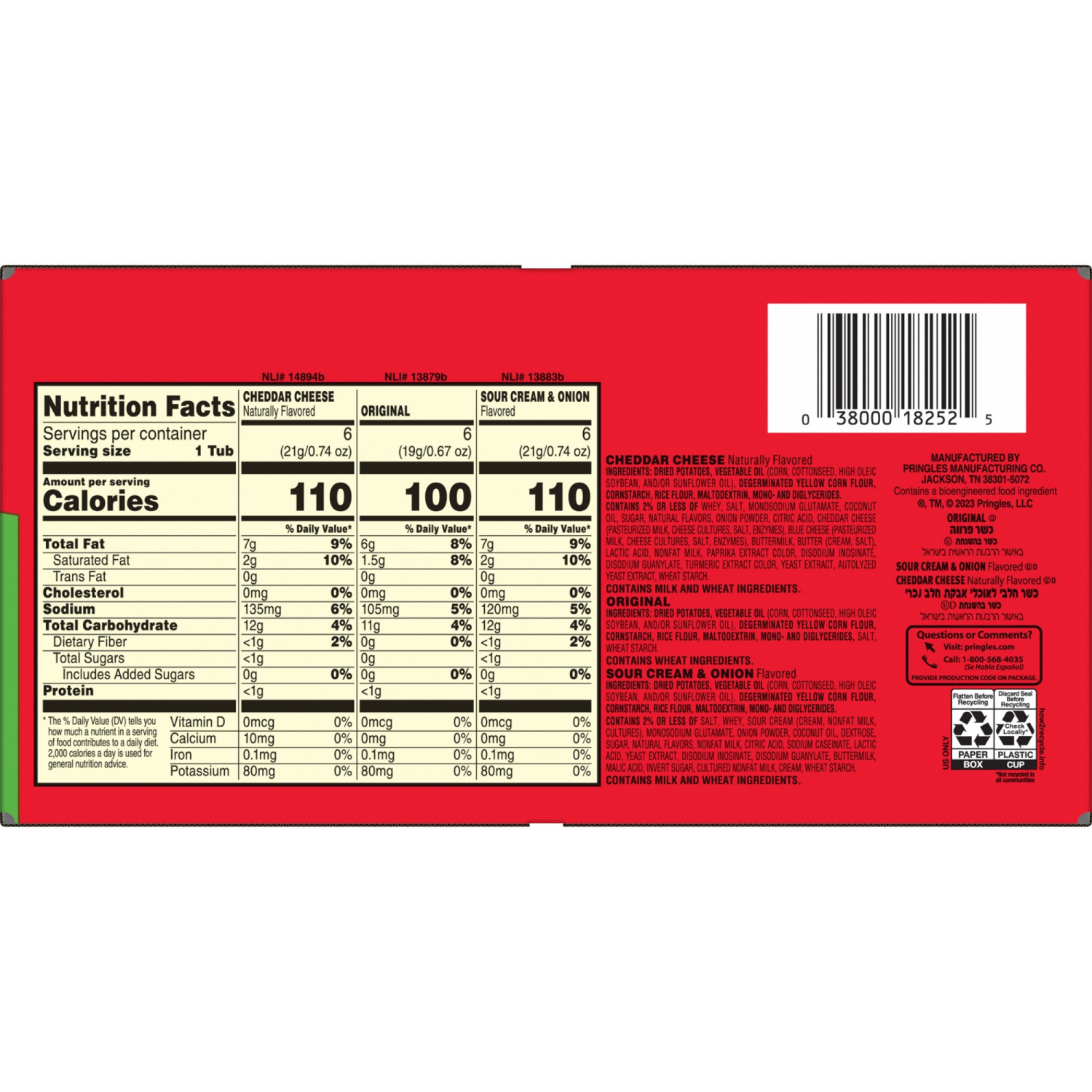 A burst of crisp, crunchy potato goodness seasoned to salty perfection. This variety pack includes three fan-favorite Pringles flavors - classic Original, zesty Sour Cream and Onion, and savory Chedda…