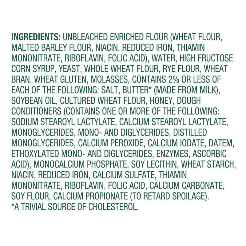 Unbleached Enriched Flour (Wheat Flour, Malted Barley Flour, Niacin, Reduced Iron, Thiamin Mononitrate, Riboflavin, Folic Acid), Water, High Fructose Corn Syrup, Yeast, Whole Wheat Flour, Rye Flour, W…